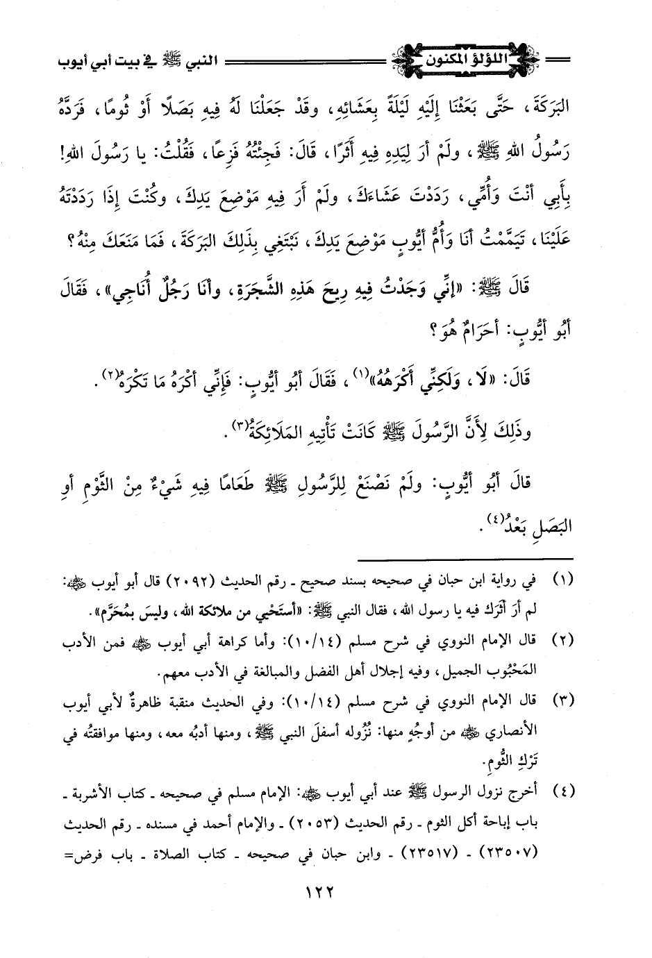 (¬4) أخرج نزول الرسول -صلى اللَّه عليه وسلم- عند أبي أيوب -رضي اللَّه عنه-: الإمام مسلم في صحيحه - كتاب الأشربة - باب إباحة أكل الثوم - رقم الحديث (2053) - والإمام أحمد في مسنده - رقم=