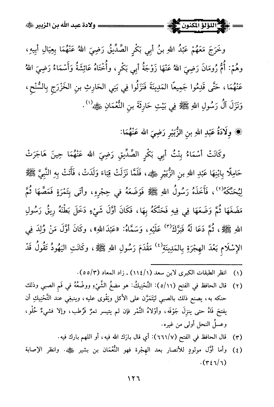 (¬4) وأما أوَّل مولودٍ للأنصار بعد الهِجْرة فهو النُّعْمَان بن بشير -رضي اللَّه عنه-. وانظر الإصابة (6/ 346).