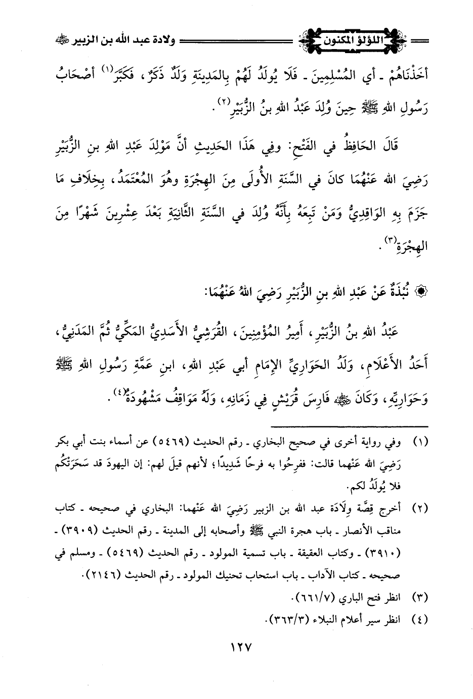 (¬2) أخرج قِصَّة وِلَادَة عبد اللَّه بن الزبير رَضِيَ اللَّه عَنْهما: البخاري في صحيحه - كتاب مناقب الأنصار - باب هجرة النبي -صلى اللَّه عليه وسلم- وأصحابه إلى المدينة - رقم الحديث (3909) - (3910) - وكتاب العقيقة - باب تسمية المولود - رقم الحديث (5469) - ومسلم في صحيحه - كتاب الآداب - باب استحباب تحنيك المولود - رقم الحديث (2146).