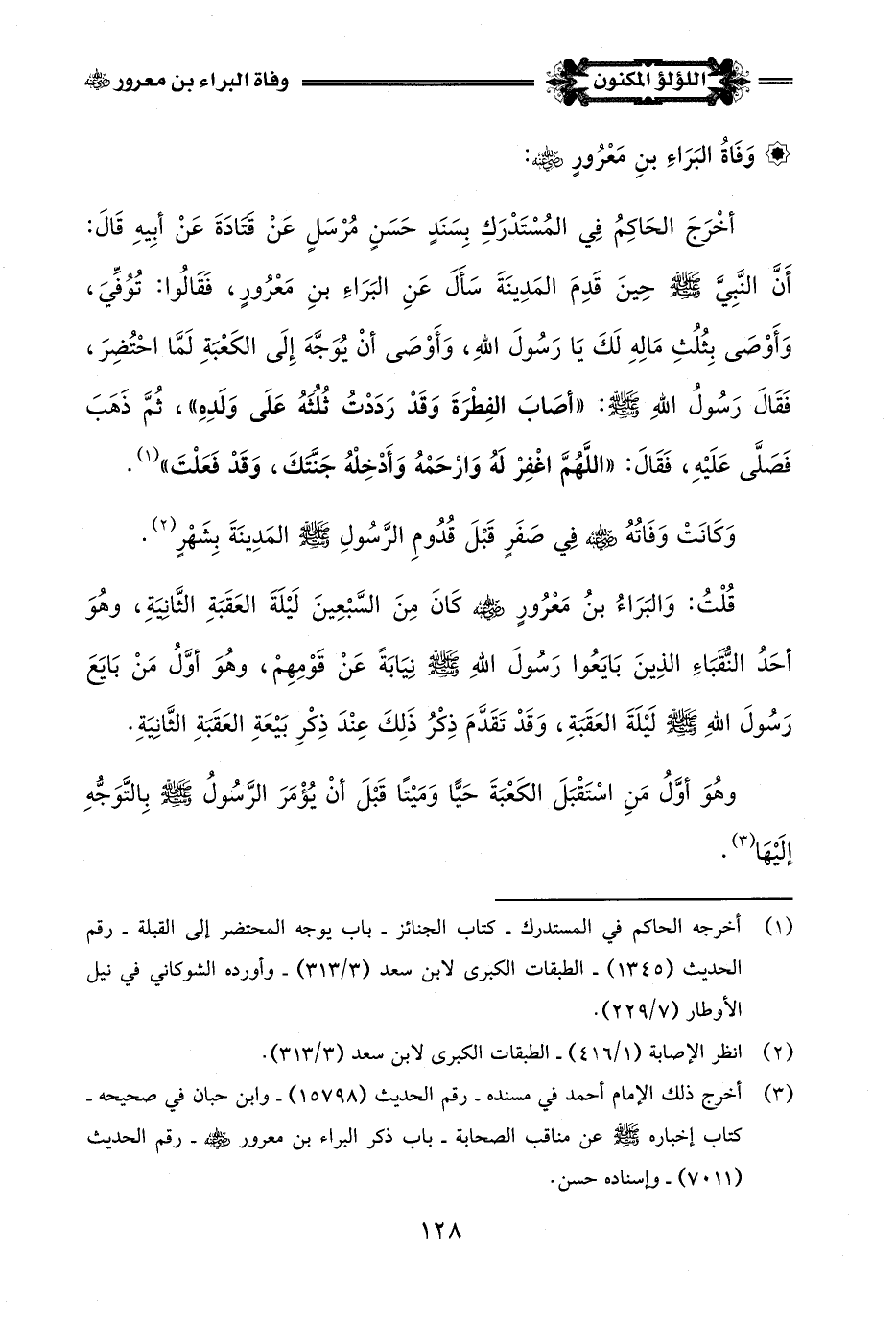 (¬3) أخرج ذلك الإمام أحمد في مسنده - رقم الحديث (15798) - وابن حبان في صحيحه - كتاب إخباره -صلى اللَّه عليه وسلم- عن مناقب الصحابة - باب ذكر البراء بن معرور -رضي اللَّه عنه- رقم الحديث (7011) - وإسناده حسن.