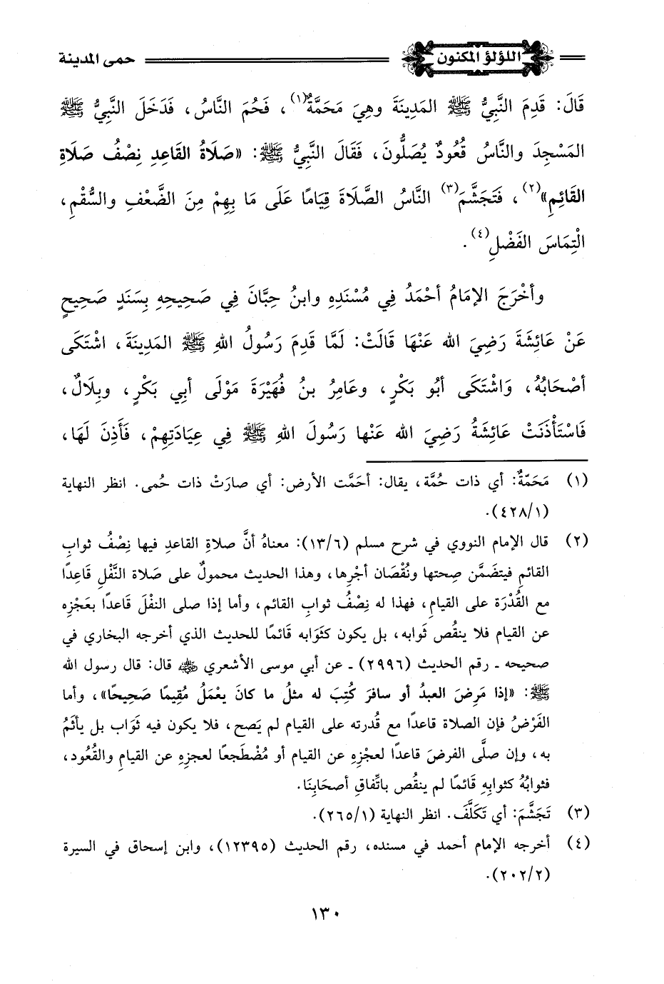 قَالَ: قَدِمَ النَّبِيُّ -صلى اللَّه عليه وسلم- المَدِينَةَ وهِيَ مَحَمَّةٌ (¬1)، فَحُمَ النَّاسُ، فَدَخَلَ النَّبِيُّ -صلى اللَّه عليه وسلم- المَسْجِدَ والنَّاسُ قُعُودٌ يُصَلُّونَ، فَقَالَ النَّبِيُّ -صلى اللَّه عليه وسلم-: "صَلَاةُ القَاعِدِ نِصْفُ صَلَاةِ القَائِمِ" (¬2)، فتَجَشَّمَ (¬3) النَّاسُ الصَّلَاةَ قِيَامًا عَلَى مَا بِهِمْ مِنَ الضَّعْفِ والسُّقْمِ، الْتِمَاسَ الفَضْلِ (¬4).