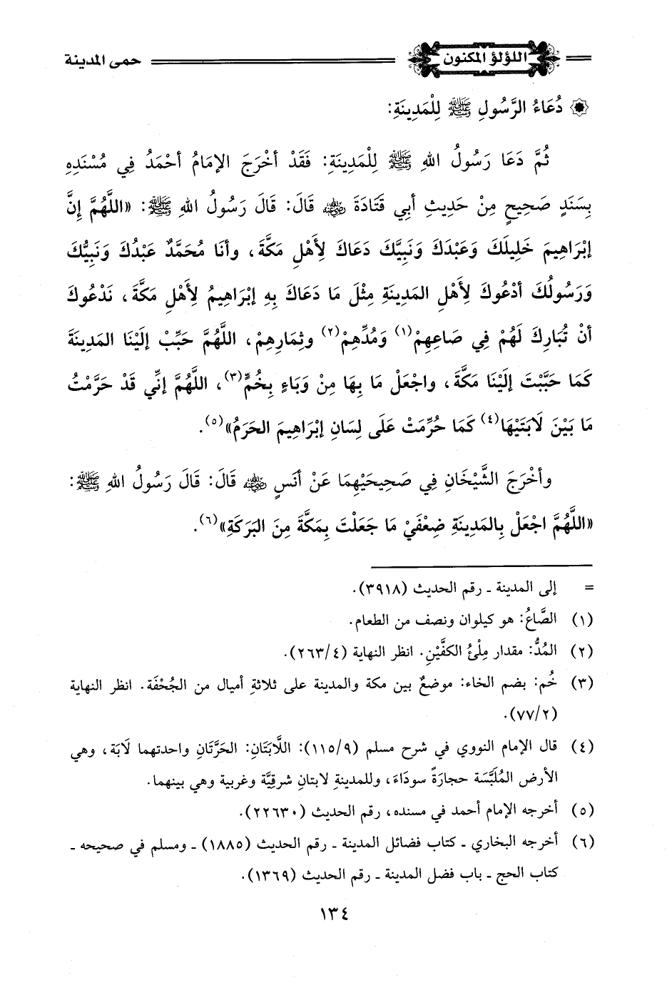 ثُمَّ دَعَا رَسُولُ اللَّه -صلى اللَّه عليه وسلم- لِلْمَدِينَةِ: فَقَدْ أخْرَجَ الإِمَامُ أَحْمَدُ فِي مُسْنَدِهِ بِسَنَدٍ صَحِيحٍ مِنْ حَدِيثِ أَبِي قتَادَةَ -رضي اللَّه عنه- قَالَ: قَالَ رَسُولُ اللَّه -صلى اللَّه عليه وسلم-: "اللَّهُمَّ إِنَّ إبْرَاهِيمَ خَلِيلَكَ وَعَبْدَكَ وَنَبِيَّكَ دَعَاكَ لِأَهْلِ مَكَّةَ، وَأَنَا مُحَمَّدٌ عَبْدُكَ وَنَبِيُّكَ وَرَسُولُكَ أدْعُوكَ لِأَهْلِ المَدِينَةِ مِثْلَ مَا دَعَاكَ بِهِ إبْرَاهِيمُ لِأَهْلِ مَكَّةَ، نَدْعُوكَ أَنْ تُبَارِكَ لَهُمْ فِي صَاعِهِمْ (¬1) وَمُدِّهِمْ (¬2) وثِمَارِهِمْ، اللَّهُمَّ حَبِّبْ إلَيْنَا المَدِينَةَ كَمَا حَبَّبْتَ إلَيْنَا مَكَّةَ، واجْعَلْ مَا بِهَا مِنْ وَبَاءٍ بِخُمٍّ (¬3)، اللَّهُمَّ إنِّي قَدْ حَرَّمْتُ مَا بَيْنَ لَابتَيْهَا (¬4) كَمَا حُرِّمَتْ عَلَى لِسَانِ إبْرَاهِيمَ الحَرَمُ" (¬5).