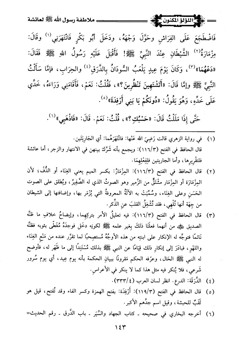 فَاضْطَجَعَ عَلَى الفِرَاشِ وحَوَّلَ وَجْهَهُ، ودَخَلَ أَبُو بَكْرٍ فَانتهَرَنِي (¬1) وَقَالَ: مِزْمَارَةُ (¬2) الشَّيْطَانِ عِنْدَ النَّبِيِّ -صلى اللَّه عليه وسلم-! فَأَقبلَ عَلَيْهِ رَسُولُ اللَّهِ -صلى اللَّه عليه وسلم- فقَالَ: "دَعْهُمَا" (¬3)، وَكَانَ يَوْمَ عِيدٍ يَلْعَبُ السُّودَانُ بِالدَّرَقِ (¬4) والحِرَابِ، فإمَّا سَأَلْتُ النَّبِيَّ -صلى اللَّه عليه وسلم- وإمَّا قَالَ: "أتشْتَهِينَ تَنْظُرِينَ؟ "، فَقُلْتُ: نَعَمْ، فَأَقَامَنِي وَرَاءَهُ، خَدِّي عَلَى خَدِّهِ، وَهُوَ يَقُولُ: "دُونَكُمْ يَا بَنِي أَرْفِدَةَ" (¬5).