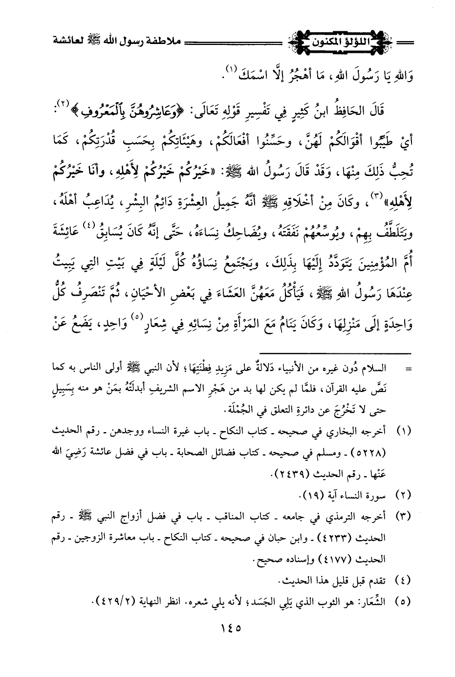 قَالَ الحَافِظُ ابنُ كَثِيرٍ فِي تَفْسِيرِ قَوْلِهِ تَعَالَى: {وَعَاشِرُوهُنَّ بِالْمَعْرُوفِ} (¬2): أيْ طَيِّبُوا أقْوَالَكُمْ لَهُنَّ، وحَسِّنُوا أفْعَالَكُمْ، وهَيْئَاتِكُمْ بِحَسَبِ قُدْرَتكُمْ، كَمَا تُحِبُّ ذَلِكَ مِنْهَا، وَقَدْ قَالَ رَسُولُ اللَّه -صلى اللَّه عليه وسلم-: "خَيْرُكُمْ خَيْرُكُمْ لِأَهْلِهِ، وأنَا خَيْرُكُمْ لِأَهْلِهِ" (¬3)، وكَانَ مِنْ أخْلَاقِهِ -صلى اللَّه عليه وسلم- أَنَّهُ جَمِيلُ العِشْرَةِ دَائِمُ البِشْرِ، يدَاعِبُ أهْلَهُ، ويَتَلَطَّفُ بِهِمْ، ويُوسِّعُهُمْ نَفَقتَهُ، ويُضَاحِكُ نِسَاءهُ، حَتَّى إِنَّهُ كَانَ يُسَابِقُ (¬4) عَائِشَةَ أُمَّ المُؤْمِنِينَ يَتَوَدَّدُ إِلَيْهَا بِذَلِكَ، ويَجْتَمعُ نِسَاؤُهُ كُلَّ لَيْلَةٍ فِي بَيْتِ التِي يَبِيتُ عِنْدَهَا رَسُولُ اللَّه -صلى اللَّه عليه وسلم-، فَيَأْكُلُ مَعَهُنَّ العَشَاءَ فِي بَعْضِ الأحْيَانِ، ثُمَّ تَنْصَرِفُ كُلُّ وَاحِدَةٍ إِلَى مَنْزِلهَا، وَكَانَ يَنَامُ مَعَ المَرْأَةِ مِنْ نِسَائِهِ فِي شِعَارٍ (¬5) وَاحِدٍ، يَضَعُ عَنْ