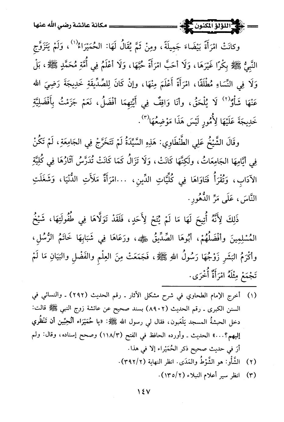 وَكَانَتْ امْرَاَةً بَيْضَاءَ جَمِيلَةً، ومِنْ ثَمَّ يُقَالُ لَهَا: الحُمَيْرَاءُ (¬1)، وَلَمْ يتَزَوَّجِ النَّبِيُّ -صلى اللَّه عليه وسلم- بِكْرًا غَيْرَهَا، وَلَا أحَبَّ امْرَأَةً حُبَّهَا، وَلَا أعْلَمُ فِي أُمَّةِ مُحَمَّدٍ -صلى اللَّه عليه وسلم-، بَلْ وَلَا فِي النِّسَاءِ مُطْلَقًا، امْرَأَةً أَعْلَمَ مِنْهَا، وَإِنْ كَانَ لِلصِّدِّيقَةِ خَدِيجَةَ رَضِيَ اللَّه عَنْهَا شَأْوٌ (¬2) لَا يُلْحَقُ، وأنا وَاقِفٌ فِي أَيِّتِهِمَا أفْضَلُ، نَعَمْ جَزَمْتُ بِأَفْضَلِيَّةِ خَدِيجَةَ عَلَيْهَا لِأُمُورٍ لَيْسَ هَذَا مَوْضِعُهَا (¬3).