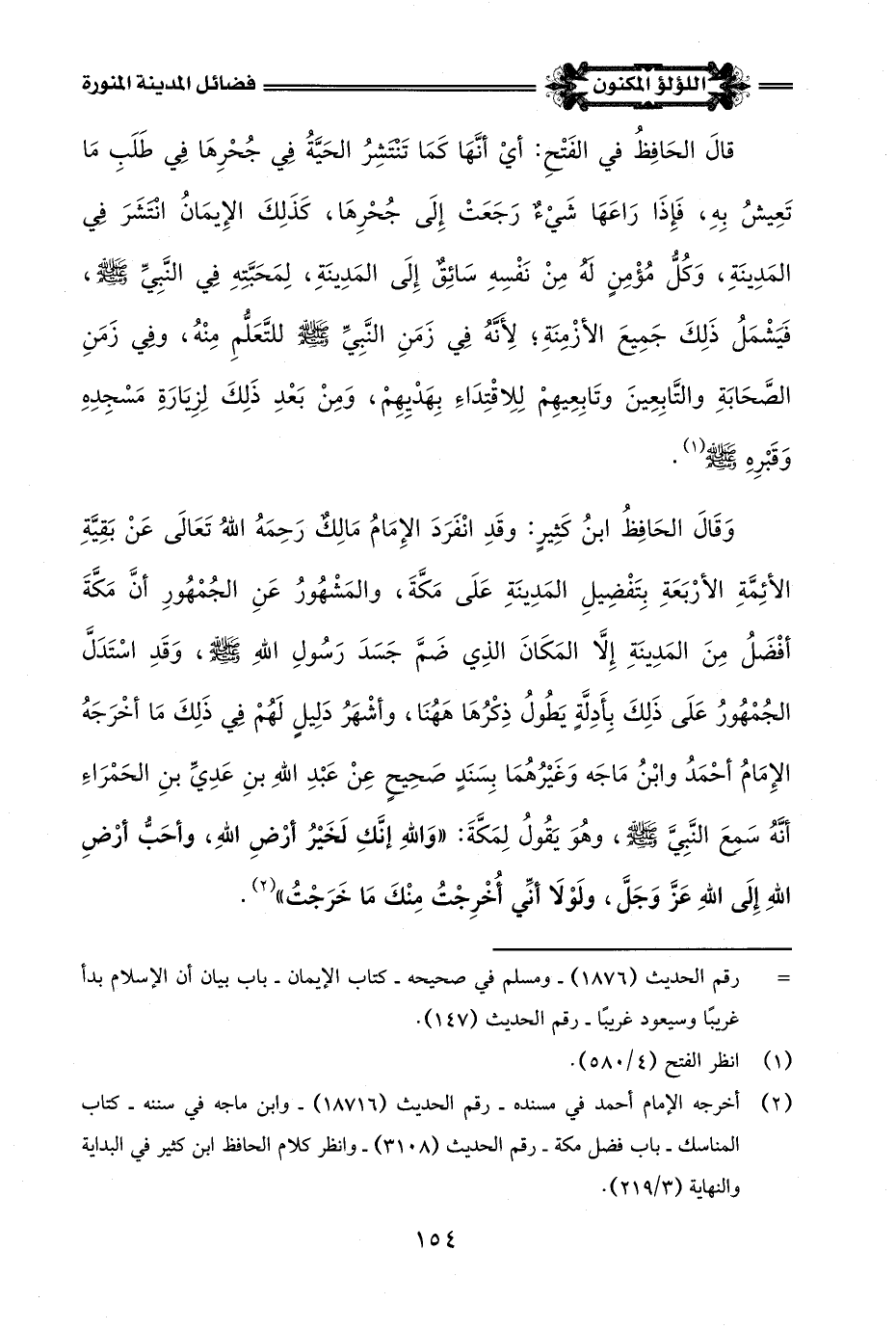 وَقَالَ الحَافِظُ ابنُ كَثِيرٍ: وقَدِ انْفَرَدَ الإِمَامُ مَالِكٌ رَحِمَهُ اللَّهُ تَعَالَى عَنْ بَقِيَّةِ الأئِمَّةِ الأرْبَعَةِ بِتَفْضِيلِ المَدِينَةِ عَلَى مَكَّةَ، والمَشْهُورُ عَنِ الجُمْهُورِ أَنَّ مَكَّةَ أفْضَلُ مِنَ المَدِينَةِ إِلَّا المَكَانَ الذِي ضَمَّ جَسَدَ رَسُولِ اللَّهِ -صلى اللَّه عليه وسلم-، وَقَدِ اسْتَدَلَّ الجُمْهُورُ عَلَى ذَلِكَ بِأَدِلَّةٍ يَطُولُ ذِكْرُهَا هَهُنَا، وأشْهَرُ دَلِيلٍ لَهُمْ في ذَلِكَ مَا أخْرَجَهُ الإِمَامُ أَحْمَدُ وابْنُ مَاجَه وَغَيْرُهُمَا بِسَنَدٍ صَحِيحٍ عِنْ عَبْدِ اللَّهِ بنِ عَدِيِّ بنِ الحَمْرَاءِ أَنَّهُ سَمِعَ النَّبِيَّ -صلى اللَّه عليه وسلم-، وهُوَ يَقُولُ لِمَكَّةَ: "وَاللَّهِ إنَّكِ لَخَيْرُ أَرْضِ اللَّهِ، وأحَبُّ أَرْضِ اللَّهِ إِلَى اللَّهِ عَزَّ وَجَلَّ، ولَوْلَا أنِّي أُخْرِجْتُ مِنْكَ مَا خَرَجْتُ" (¬2).