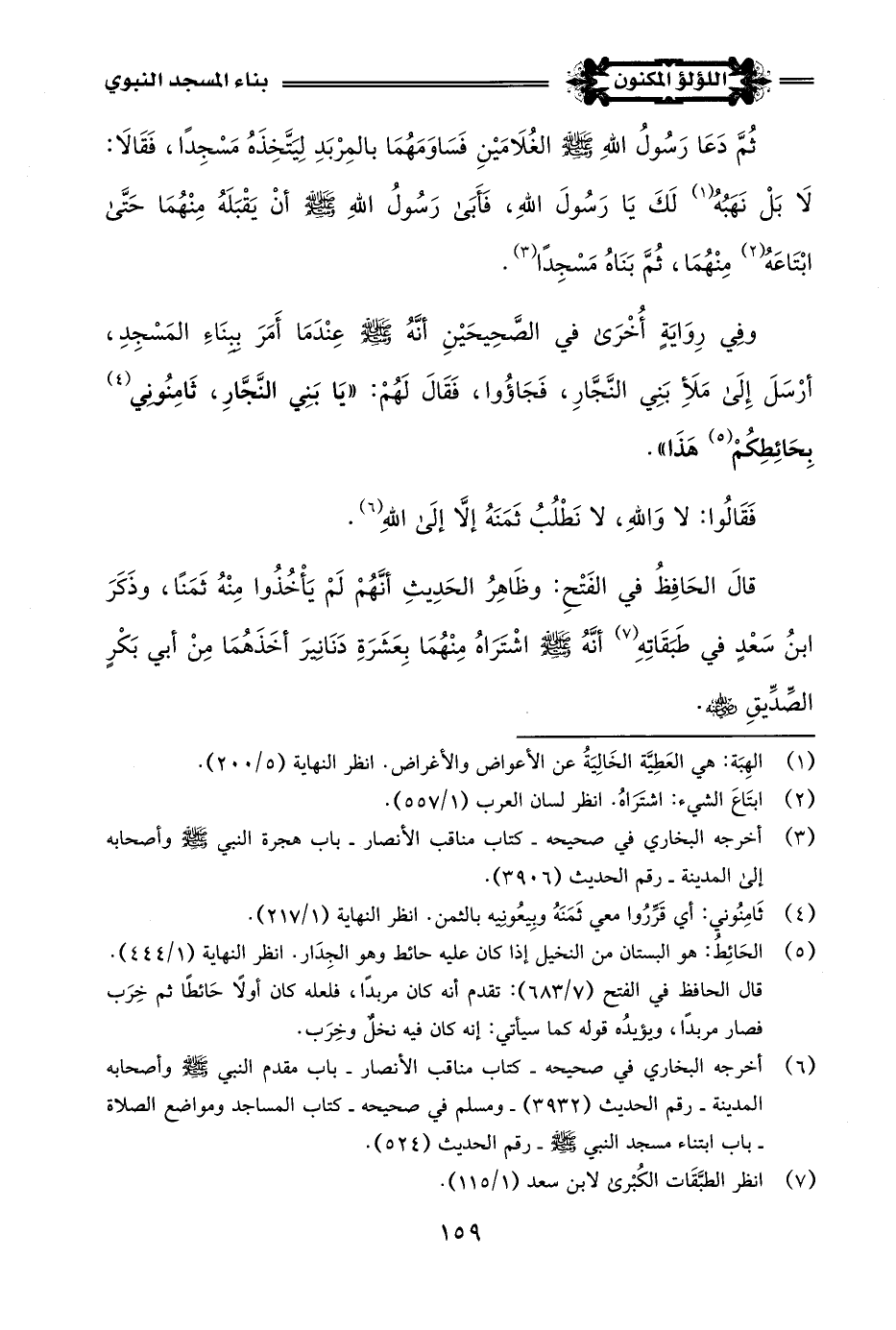 ثُمَّ دَعَا رَسُولُ اللَّهِ -صلى اللَّه عليه وسلم- الغُلَامَيْنِ فَسَاوَمَهُمَا بالمِرْبَدِ لِيَتَّخذَهُ مَسْجِدًا، فَقَالَا: لَا بَلْ نَهَبُهُ (¬1) لَكَ يَا رَسُولَ اللَّهِ، فَأبَى رَسُولُ اللَّهِ -صلى اللَّه عليه وسلم- أَنْ يَقْبَلَهُ مِنْهُمَا حتَّى ابْتَاعَهُ (¬2) مِنْهُمَا، ثُمَّ بَنَاهُ مَسْجِدًا (¬3).