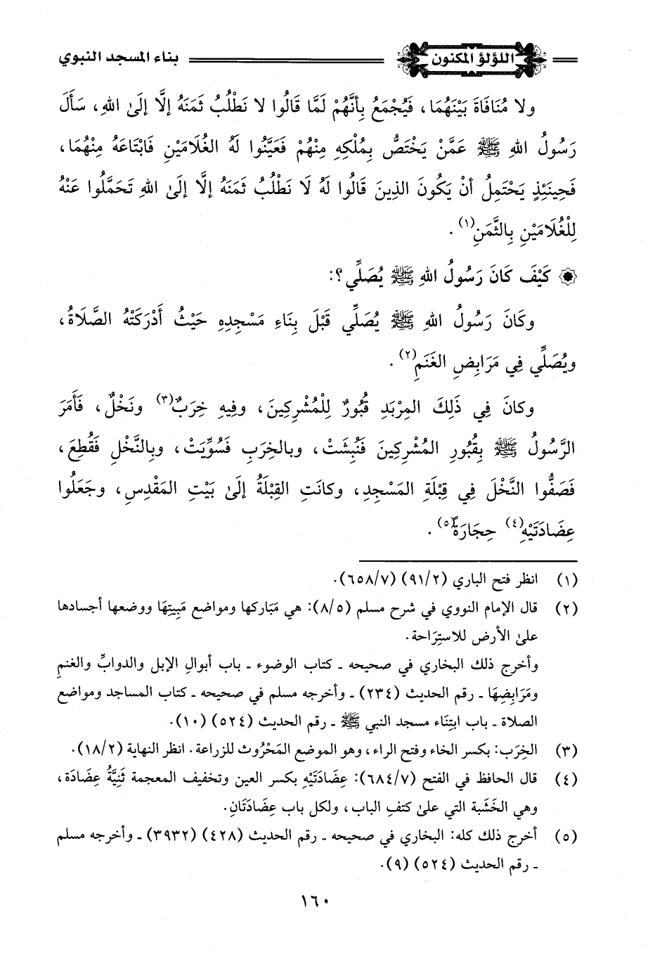 وَكَانَ في ذَلِكَ المِرْبَدِ قُبُورٌ لِلْمُشْرِكِينَ، وفيهِ خِرَبٌ (¬3) ونَخْلٌ، فَأَمَرَ الرَّسُولُ -صلى اللَّه عليه وسلم- بِقُبُورِ المُشْرِكِينَ فنبِشَتْ، وبالخِرَبِ فَسُوِّيَتْ، وبِالنَّخْلِ فَقُطِعَ، فَصَفُّوا النَّخْلَ في قِبْلَةِ المَسْجِدِ، وَكَانَتِ القِبْلَةُ إِلَى بَيْتِ المَقْدِسِ، وجَعَلُوا عِضَادَتَيْهِ (¬4) حِجَارَةً (¬5).