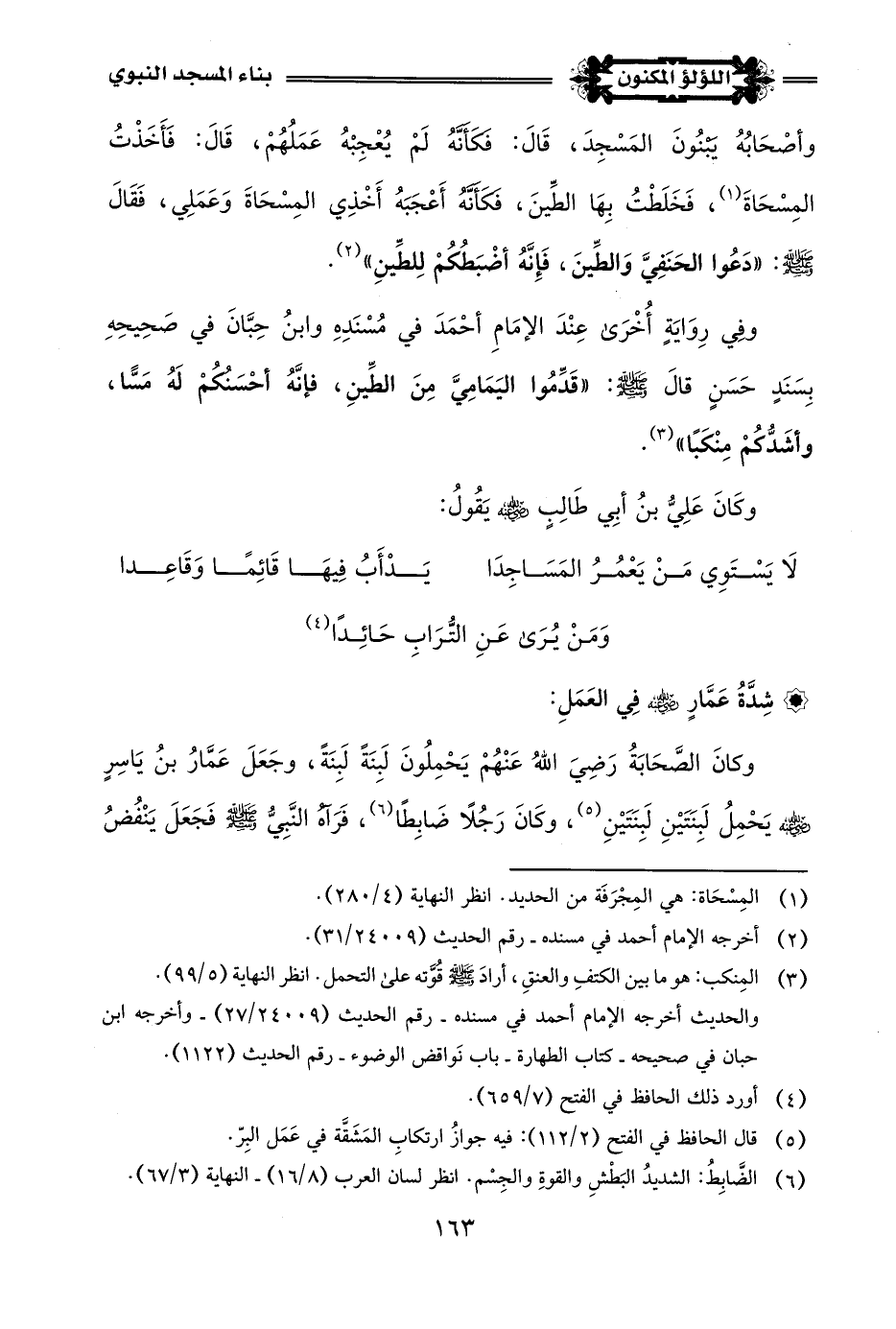 وَكَانَ الصَّحَابَةُ رَضِيَ اللَّهُ عَنْهُمْ يَحْمِلُونَ لَبِنَة لَبِنَةً، وجَعَلَ عَمَّارُ بنُ يَاسِرٍ -رضي اللَّه عنه- يَحْمِلُ لَبِنَتَيْنِ لَبِنَتَيْنِ (¬5)، وكَانَ رَجُلًا ضَابِطًا (¬6)، فَرَآهُ النَّبِيُّ -صلى اللَّه عليه وسلم- فَجَعَلَ يَنْفُضُ