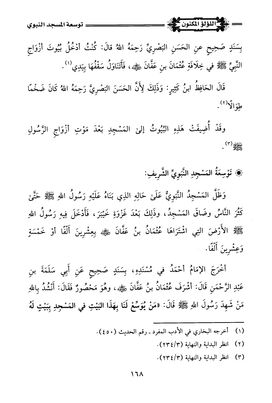 أخْرَجَ الإِمَامُ أَحْمَدُ في مُسْنَدِهِ، بِسَنَدٍ صَحِيحٍ عَنِ أَبِي سَلَمَةَ بنِ عَبْدِ الرَّحْمَنِ قَالَ: أشْرَفَ عُثْمَانُ بنُ عَفَّانَ -رضي اللَّه عنه-، وهُوَ مَحْصُورٌ فَقَالَ: أَنْشُدُ بِاللَّهِ مَنْ شَهِدَ رَسُولَ اللَّهِ -صلى اللَّه عليه وسلم- قَالَ: "مَنْ يُوَسِّعْ لَنَا بِهَذَا البَيْتِ في المَسْجدِ بِبَيْتٍ لَهُ