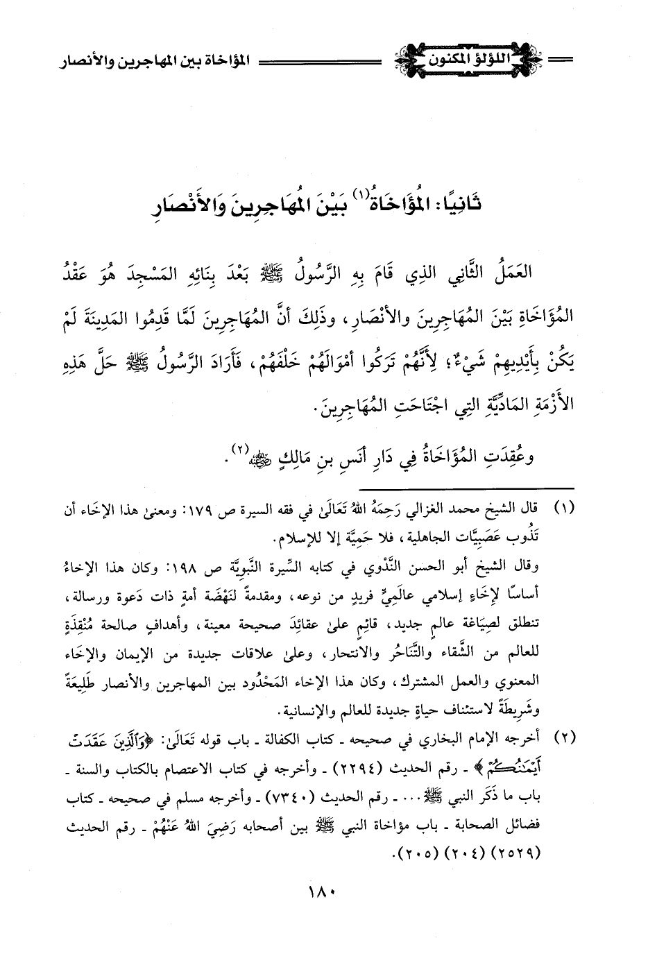 (¬2) أخرجه الإمام البخاري في صحيحه - كتاب الكفالة - باب قوله تَعَالَى: {وَالَّذِينَ عَقَدَتْ أَيْمَانُكُمْ} - رقم الحديث (2294) - وأخرجه في كتاب الاعتصام بالكتاب والسنة - باب ما ذَكَر النبي -صلى اللَّه عليه وسلم-. . . - رقم الحديث (7340) - وأخرجه مسلم في صحيحه - كتاب فضائل الصحابة - باب مؤاخاة النبي -صلى اللَّه عليه وسلم- بين أصحابه رَضِيَ اللَّهُ عَنْهُمْ - رقم الحديث (2529) (204) (205).