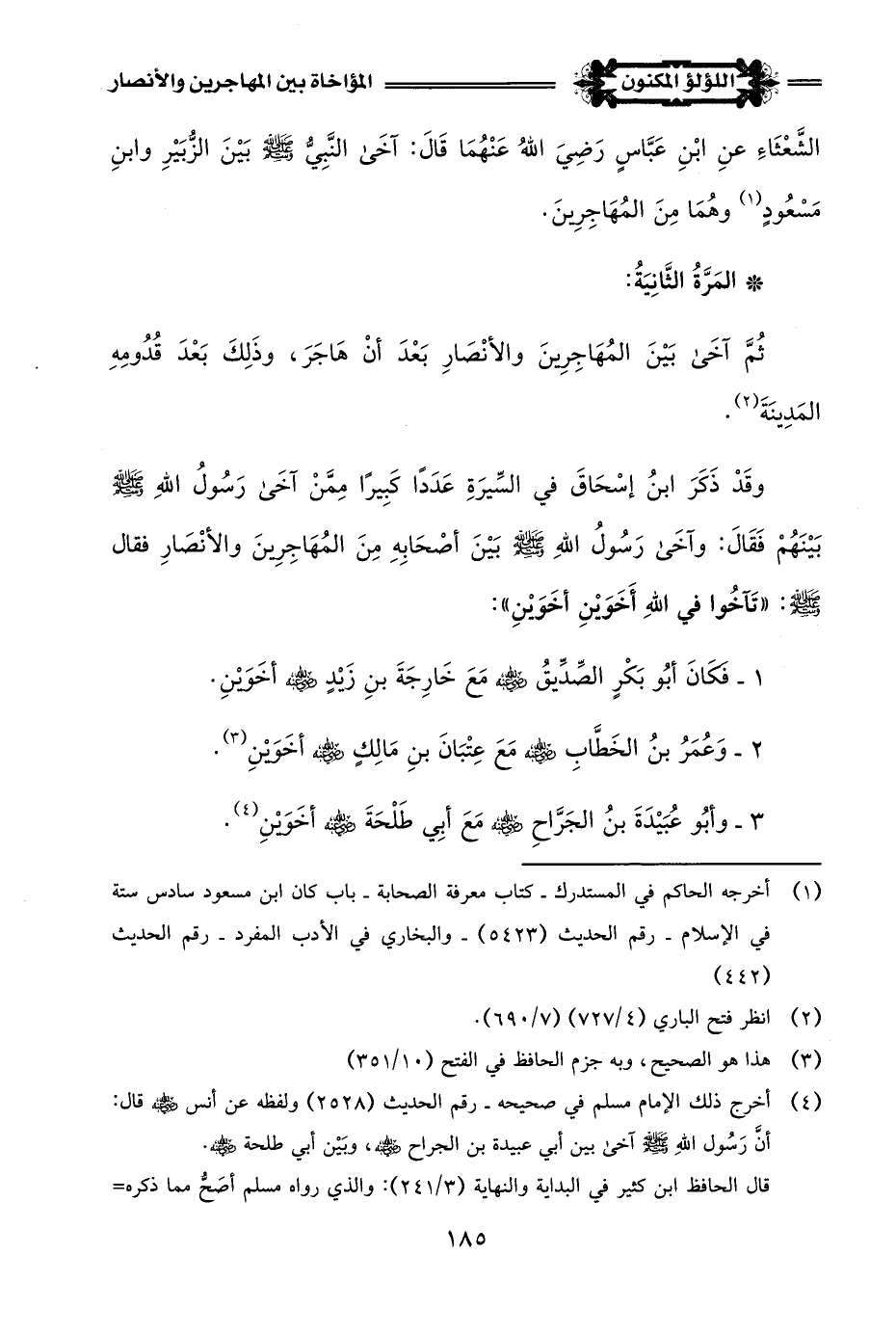 (¬4) أخرج ذلك الإِمام مسلم في صحيحه - رقم الحديث (2528) ولفظه عن أنس -رضي اللَّه عنه- قال: أَنَّ رَسُول اللَّهِ -صلى اللَّه عليه وسلم- آخى بين أبي عبيدة بن الجراح -رضي اللَّه عنه-، وبَيْن أبي طلحة -رضي اللَّه عنه-.