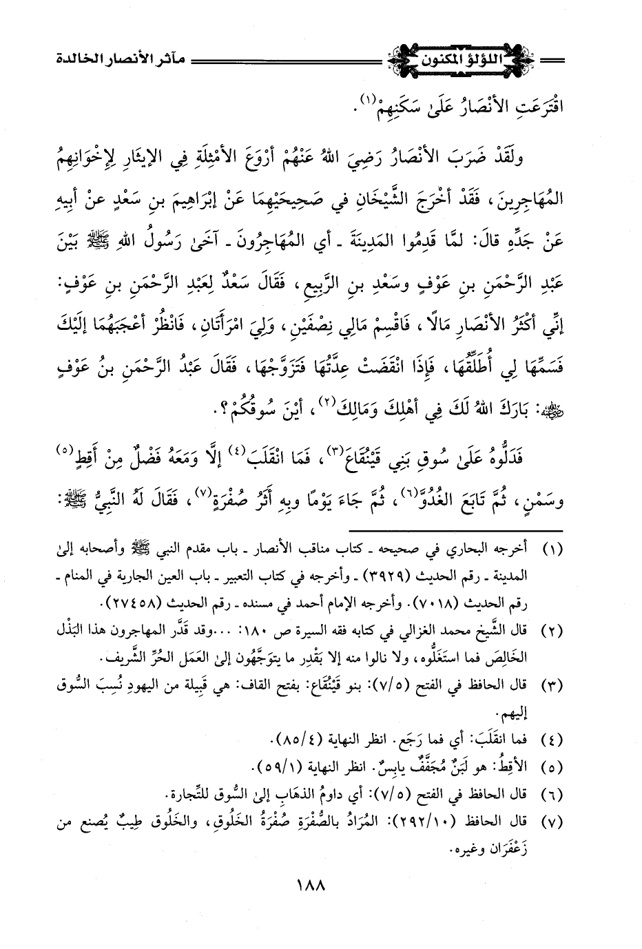(¬2) قال الشَّيخ محمد الغزالي في كتابه فقه السيرة ص 180: . . . وقد قَدَّر المهاجرون هذا البَذْل الخَالِصَ فما استَغَلُّوه، ولا نالوا منه إِلَّا بَقْدِر ما يتوَجَّهُون إلى العَمَل الحُرِّ الشَّريف.