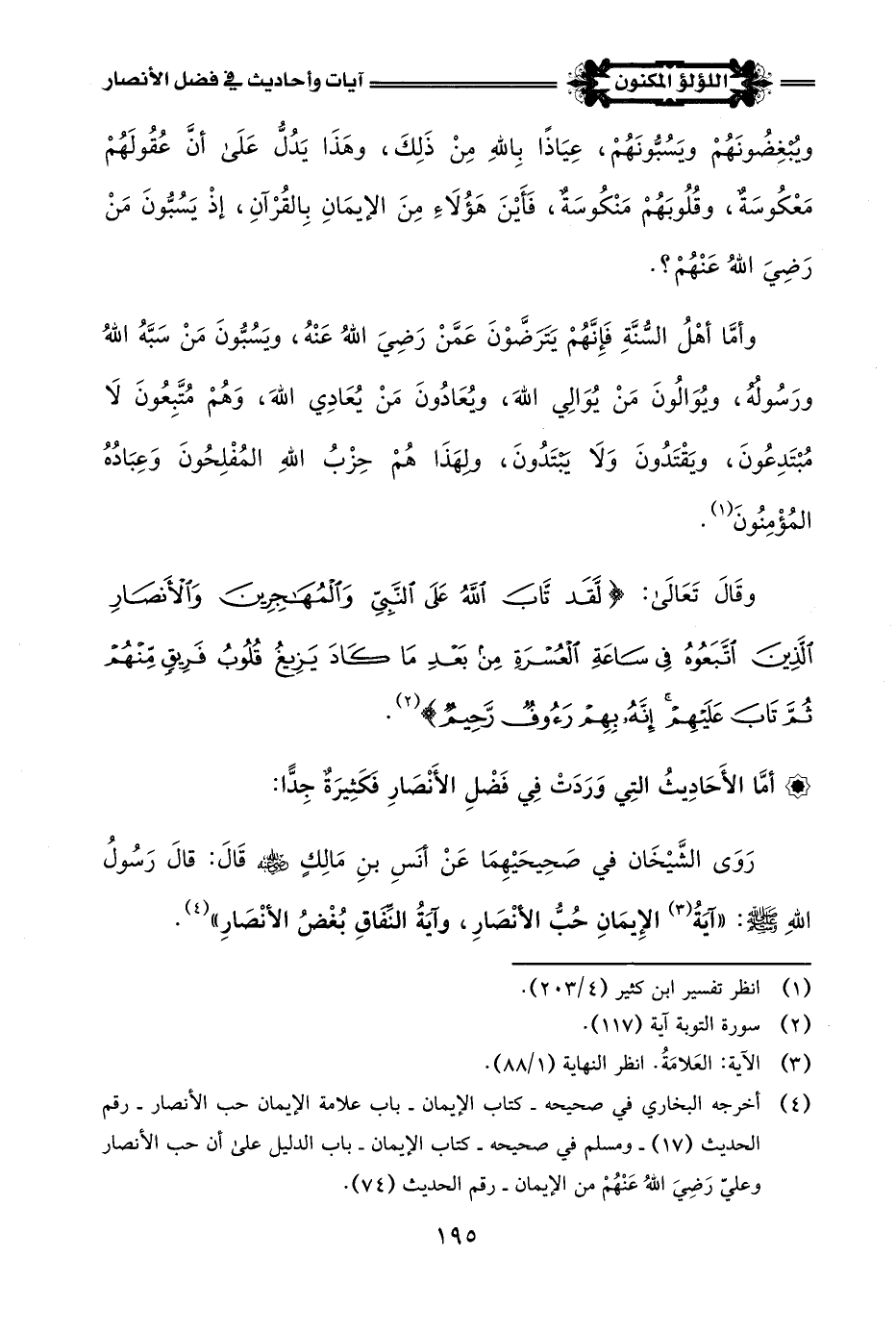 (¬4) أخرجه البخاري في صحيحه - كتاب الإيمان - باب علامة الإيمان حب الأنصار - رقم الحديث (17) - ومسلم في صحيحه - كتاب الإيمان- باب الدليل على أن حب الأنصار وعليّ رَضِيَ اللَّهُ عَنْهُمْ من الإيمان - رقم الحديث (74).