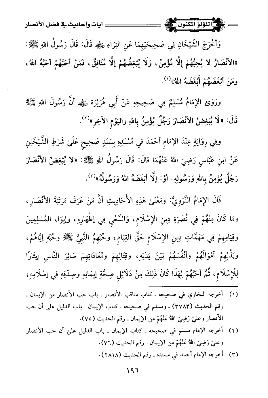 وَأَخْرَجَ الشَّيْخَانِ في صَحِيحَيْهِمَا عَنِ البَرَاءِ -رضي اللَّه عنه- قَالَ: قَالَ رَسُولُ اللَّهِ -صلى اللَّه عليه وسلم-: "الأَنْصَارُ لا يُحِبُّهُمْ إِلَّا مُؤْمِنٌ، وَلَا يُبْغِضُهُمْ إِلَّا مُنَافِقٌ، فَمَنْ أحَبَّهُمْ أحَبَّهُ اللَّهُ، ومَنْ أَبْغَضَهُمْ أَبْغَضَهُ اللَّهُ" (¬1).