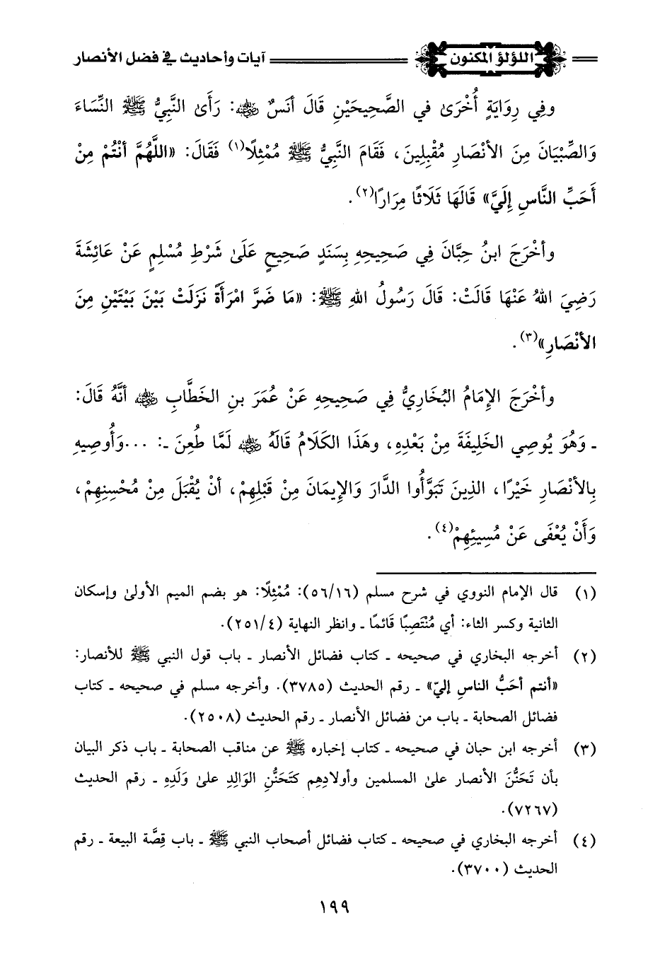 (¬3) أخرجه ابن حبان في صحيحه - كتاب إخباره -صلى اللَّه عليه وسلم- عن مناقب الصحابة - باب ذكر البيان بأن تَحَنُّنَ الأنصار على المسلمين وأولادِهِم كتَحَنُّنِ الوَالِدِ على وَلَدِهِ - رقم الحديث (7267).