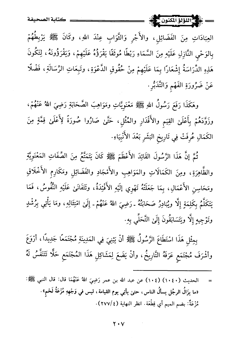وهَكَذَا رَفَعَ رَسُولُ اللَّهِ -صلى اللَّه عليه وسلم- مَعْنَوِيَّاتِ ومَوَاهِبَ الصَّحَابَةِ رَضِيَ اللَّهُ عَنْهُمْ، وزَوَّدَهُمْ بِأعْلَى القِيَمِ والأَقْدَارِ والمُثُلِ، حَتَّى صَارُوا صُورَةً لِأَعْلَى قِمَّةٍ مِنَ الكَمَالِ عُرِفَتْ في تَارِيخِ البَشَرِ بَعْدَ الأَنْبِيَاءِ.