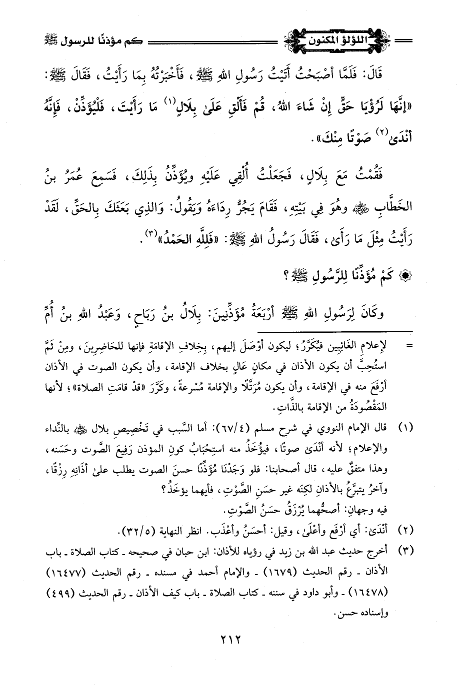وكَانَ لِرَسُولِ اللَّهِ -صلى اللَّه عليه وسلم- أَرْبَعَةُ مُؤَذِّنِينَ: بِلَالُ بنُ رَبَاحٍ، وَعَبْدُ اللَّهِ بنُ أُمِّ