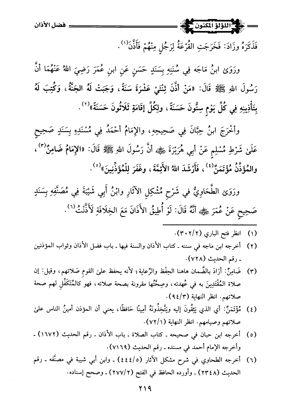 وَأَخْرَجَ ابنُ حِبَّانَ في صَحِيحِهِ، والإِمَامُ أَحْمَدُ في مُسْنَدِهِ بِسَنَدٍ صَحِيحٍ عَلَى شَرْطِ مُسْلِمٍ عَنْ أَبِي هُرَيْرَةَ -رضي اللَّه عنه- أَنَّ رَسُولَ اللَّهِ -صلى اللَّه عليه وسلم- قَالَ: "الإِمَامُ ضَامِنٌ (¬3)، والمُؤَذِّنُ مُؤْتَمَنٌ (¬4)، فَأَرْشَدَ اللَّهُ الأَئِمَّةَ، وغَفَرَ لِلْمُؤَذِّنِينَ" (¬5).