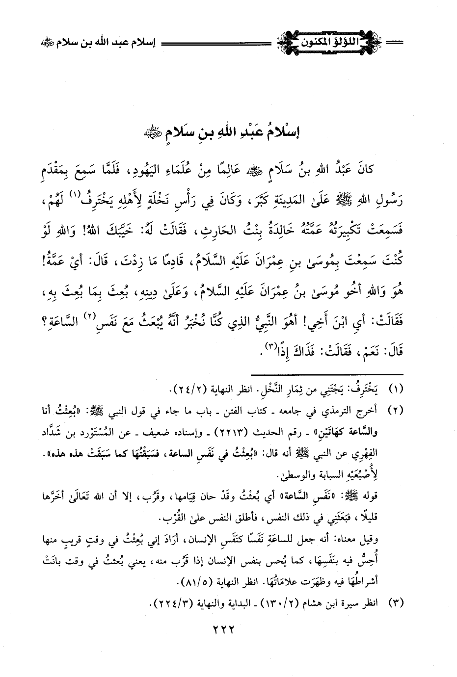 كَانَ عَبْدُ اللَّهِ بنُ سَلَامٍ -رضي اللَّه عنه- عَالِمًا مِنْ عُلَمَاءَ اليَهُودِ، فَلَمَّا سَمِعَ بِمَقْدَمِ رَسُولِ اللَّهِ -صلى اللَّه عليه وسلم- عَلَى المَدِينَةِ كَبَّرَ، وَكَانَ في رَأْسِ نَخْلَةٍ لِأَهْلِهِ يَخْتَرِفُ (¬1) لَهُمْ، فَسَمِعَتْ تَكْبِيرَتُهُ عَمَّتُهُ خَالِدَةُ بِنْتُ الحَارِثِ، فَقَالَتْ لَهُ: خَيَبكَ اللَّهُ! وَاللَّهِ لَوْ كُنْتَ سَمِعْتَ بِمُوسَى بنِ عِمْرَانَ عَلَيْهِ السَّلَامُ، قَادِمًا مَا زِدْتَ، قَالَ: أيْ عَمَّةُ! هُوَ وَاللَّهِ أخُو مُوسَى بنُ عِمْرَانَ عَلَيْهِ السَّلامُ، وَعَلَى دِينهِ، بُعِثَ بِمَا بُعِثَ بِهِ، فَقَالَتْ: أي ابْنَ أَخِي! أهُوَ النَّبِيُّ الذِي كُنَّا نُخْبَرُ أنَّهُ يبعَثُ مَعَ نَفَسِ (¬2) السَّاعَةِ؟ قَالَ: نَعَمْ، فَقَالَتْ: فَذَاكَ إِذًا (¬3).