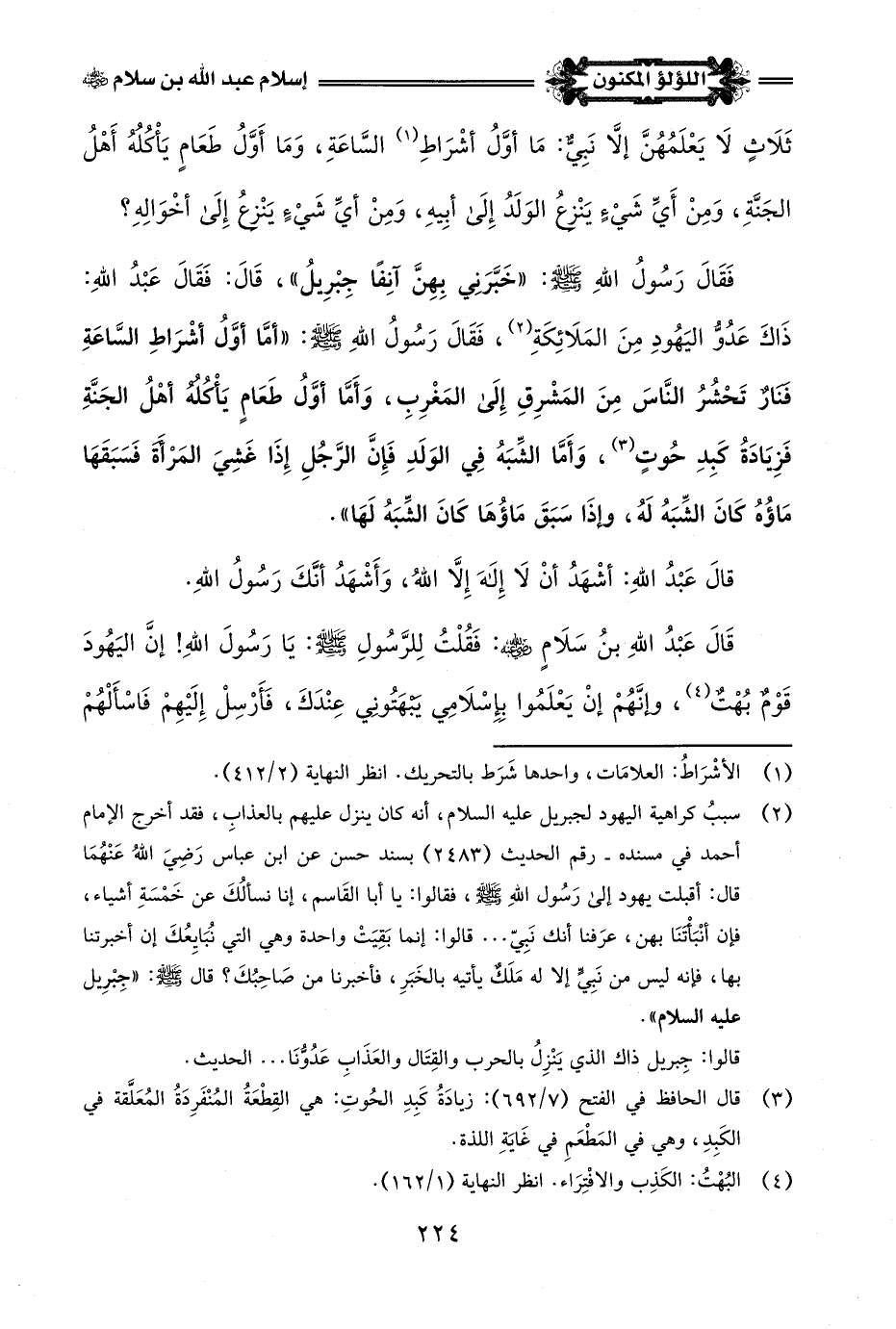 فَقَالَ رَسُولُ اللَّهِ -صلى اللَّه عليه وسلم-: "خَبَّرَني بِهِنَّ آنِفًا جِبْرِيلُ"، قَالَ: فَقَالَ عَبْدُ اللَّهِ: ذَاكَ عَدُوُّ اليَهُودِ مِنَ المَلَائِكَةِ (¬2)، فَقَالَ رَسُولُ اللَّهِ -صلى اللَّه عليه وسلم-: "أَمَّا أوَّلُ أشْرَاطِ السَّاعَةِ فَنَارٌ تَحْشُرُ النَّاسَ مِنَ المَشْرِقِ إلى المَغْرِبِ، وَأَمَّا أوَّلُ طَعَامٍ يَأْكله أَهْلُ الجَنَّةِ فَزِيَادَةُ كَبِدِ حُوتٍ (¬3)، وَأَمَّا الشِّبَهُ في الوَلَدِ فَإِنَّ الرَّجُلِ إِذَا غَشِيَ المَرْأة فَسَبَقَهَا مَاؤُهُ كَانَ الشِّبَهُ لَهُ، وَإِذَا سَبَقَ مَاؤُهَا كَانَ الشِّبَهُ لَهَا".