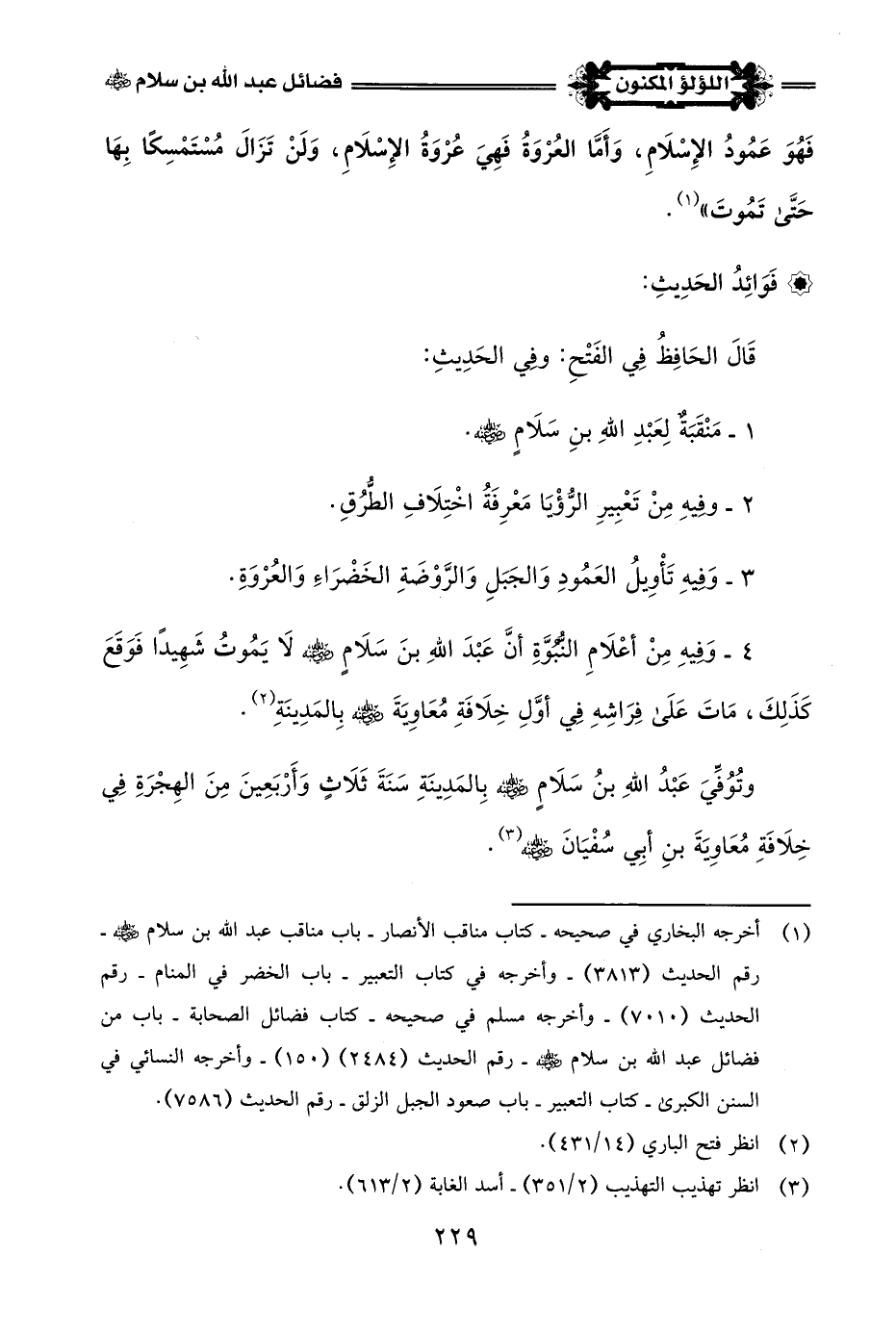 (¬1) أخرجه البخاري في صحيحه - كتاب مناقب الأنصار - باب مناقب عبد اللَّه بن سلام -رضي اللَّه عنه- رقم الحديث (3813) - وأخرجه في كتاب التعبير - باب الخضر في المنام - رقم الحديث (7010) - وأخرجه مسلم في صحيحه - كتاب فضائل الصحابة - باب من فضائل عبد اللَّه بن سلام -رضي اللَّه عنه- رقم الحديث (2484) (150) - وأخرجه النسائي في السنن الكبرى - كتاب التعبير - باب صعود الجبل الزلق - رقم الحديث (7586).