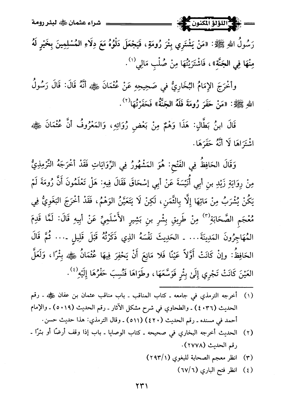 وَقَالَ الحَافِظُ في الفَتْحِ: هُوَ المَشْهُورُ في الرِّوَايَاتِ فَقَدْ أخْرَجَهُ التِّرْمِذِيُّ مِنْ رِوَايَةِ زَيْدِ بنِ أَبِي أُنيْسَةَ عَنْ أَبِي إسْحَاقَ فَقَالَ فِيهِ: هَلْ تَعْلَمُونَ أَنَّ رُومَةَ لَمْ يَكُنْ يُشْرَبُ مِنْ مَائِهَا إِلَّا بِالثَّمَنِ، لَكِنْ لَا يَتَعَيَّنُ الوَهْمُ، فَقَدْ أخْرَجَ البَغَوِيُّ في مُعْجَمِ الصَّحَابَةِ (¬3) مِنْ طَرِيقِ بِشْرِ بنِ بَشِيرٍ الأَسْلَمِيِّ عَنْ أبِيهِ قَالَ: لَمَّا قَدِمَ المُهَاجِرُونَ المَدِينَةَ. . . -الحَدِيثَ نَفْسَهُ الذِي ذَكَرتُهُ قَبْلَ قَلِيلٍ-. . . ثُمَّ قَالَ الحَافِظُ: وَإِنْ كَانَتْ أَوَّلًا عَيْنًا فَلا مَانِعَ أَنْ يَحْفِرَ فِيهَا عُثْمَانُ -رضي اللَّه عنه- بِئْرًا، وَلَعَلَّ العَيْنَ كَانَتْ تَجْرِي إلى بِئْرٍ فَوَسَّعَهَا، وطَوَاهَا فَنُسِبَ حَفْرُهَا إِلَيْهِ (¬4).