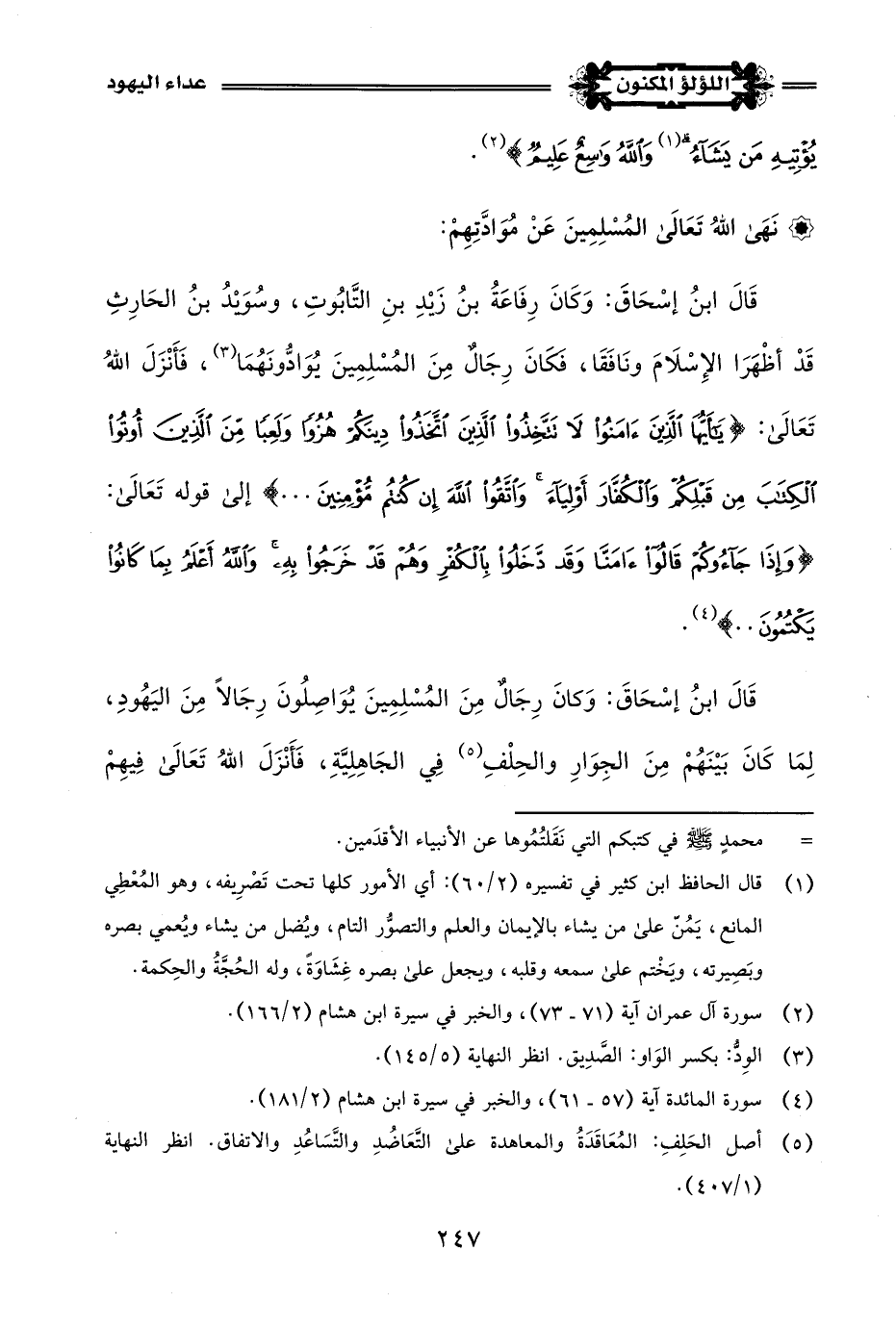 قَالَ ابنُ إسْحَاقَ: وَكانَ رِجَالٌ مِنَ المُسْلِمِينَ يُوَاصِلُونَ رِجَالًا مِنَ اليَهُودِ، لِمَا كَانَ بَيْنَهُمْ مِنَ الجِوَارِ والحِلْفِ (¬5) في الجَاهِلِيَّةِ، فَأَنْزَلَ اللَّهُ تَعَالَى فِيهِمْ