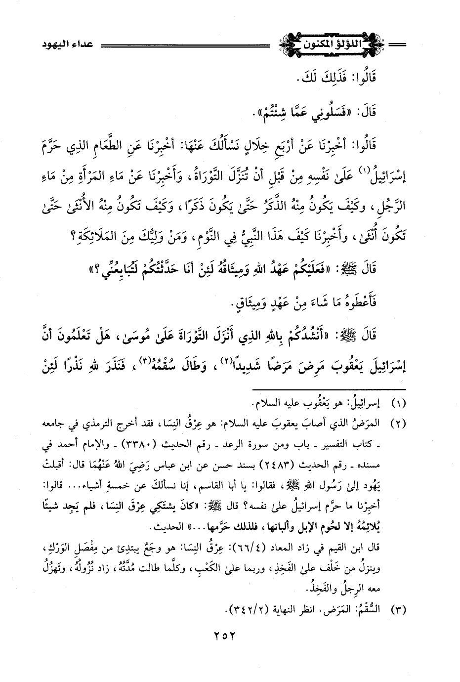 قَالَ -صلى اللَّه عليه وسلم-: "أَنْشُدُكُمْ بِاللَّهِ الذِي أَنْزَلَ التَّوْرَاةَ عَلَى مُوسَى، هَلْ تَعْلَمُونَ أَنَّ إسْرَائِيلَ يَعْقُوبَ مَرِضَ مَرَضًا شَدِيدًا (¬2)، وَطَالَ سُقْمُهُ (¬3)، فنذَرَ للَّهِ نَذْرًا لَئِنْ
