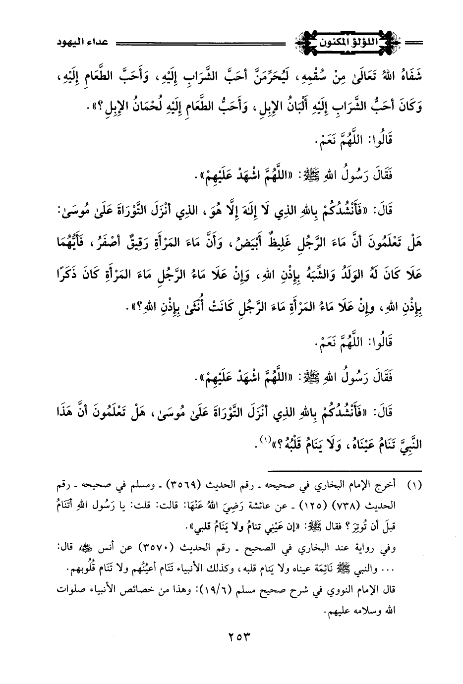 قَالَ: "فَأَنْشُدُكُمْ بِاللَّهِ الذِي أنْزَلَ التَّوْرَاةَ عَلَى مُوسَى، هَلْ تَعْلَمُونَ أَنَّ هَذَا النَّبِيَّ تَنَامُ عَيْنَاهُ، وَلَا يَنَامُ قَلْبُهُ؟ " (¬1).