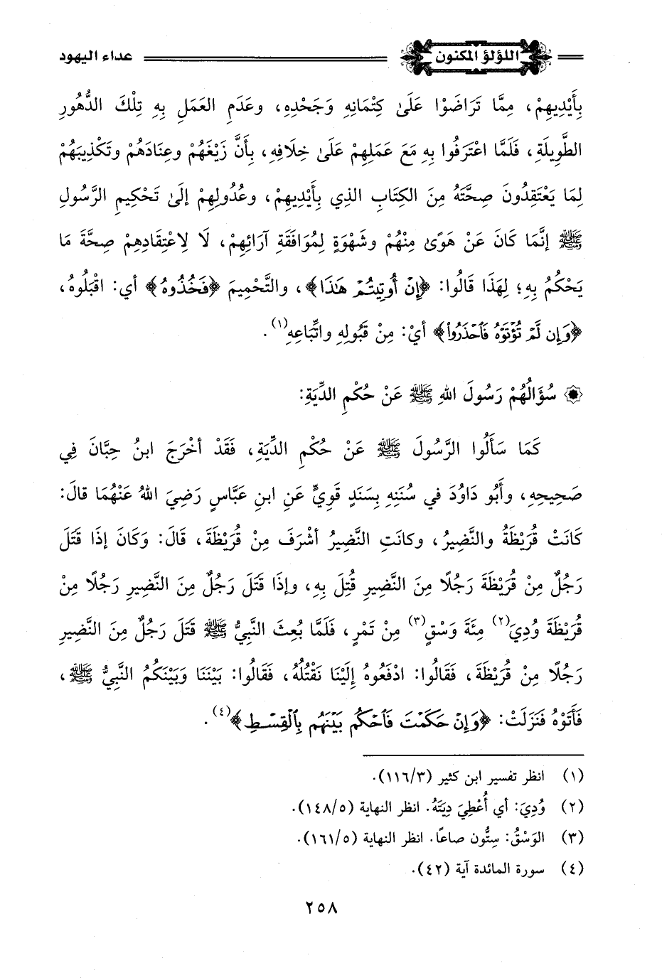 (¬4) سورة المائدة آية (50) - والحديث أخرجه ابن حبان في صحيحه - كتاب القضاء - باب الإخبار عن السبب الذي من أجله أنزل اللَّه جل وعلا {وَإِنْ حَكَمْتَ فَاحْكُمْ بَيْنَهُمْ بِالْقِسْطِ} - رقم الحديث (5057) - وأخرجه أبو داود في سننه - كتاب الديات - باب النفس بالنفس - رقم الحديث (4494).