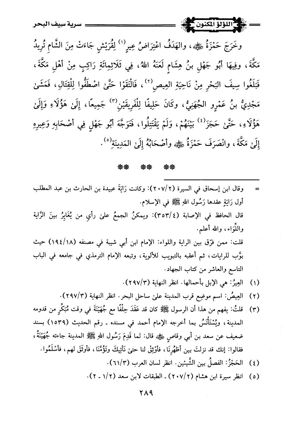 (¬3) انظر تفاصيل هذه السَّرية في: سيرة ابن هشام (2/ 203) - الطبَّقَات الكُبْرى لابن سعد (1/ 252) - البداية والنهاية (3/ 257) - دلائل النبوة للبيهقي (3/ 9).