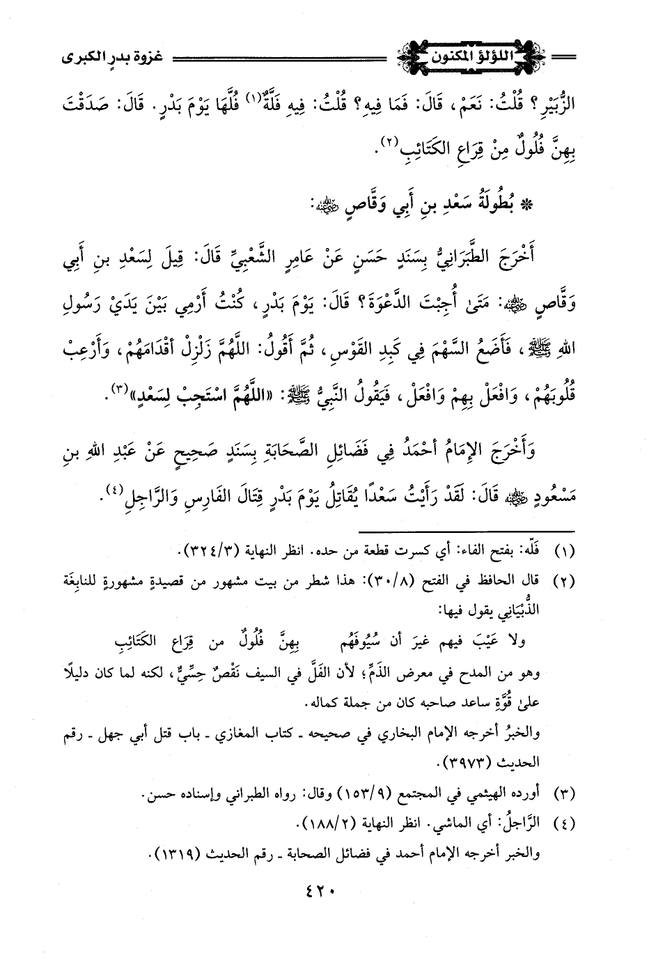 وَأَخْرَجَ الإِمَامُ أَحْمَدُ فِي مُسْنَدِهِ بِسَنَدٍ حَسَنٍ عَنْ أَبِي دَاوُدَ المَازِنيِّ -رضي اللَّه عنه-وَكَانَ شَهِدَ بَدْرًا- قَالَ: إِنِّي لَأَتْبَعُ رَجُلًا مِنَ المُشْرِكِينَ لِأَضْرِبَهُ، إِذْ وَقَعَ رَأْسُهُ قَبْلَ أَنْ يَصِلَ إِلَيْهِ سَيْفِي، فَعَرَفْتُ أَنَّهُ قَدْ قتَلَهُ غَيْرِي (¬2).
