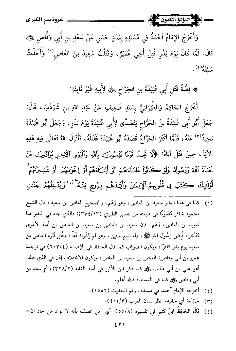 (¬4) أخرجه الحاكم في المستدرك - كتاب معرفة الصحابة - باب أول غزوة في الإسلام بدر - رقم الحديث (5608) - وابن سعد في طبقاته (3/ 55).