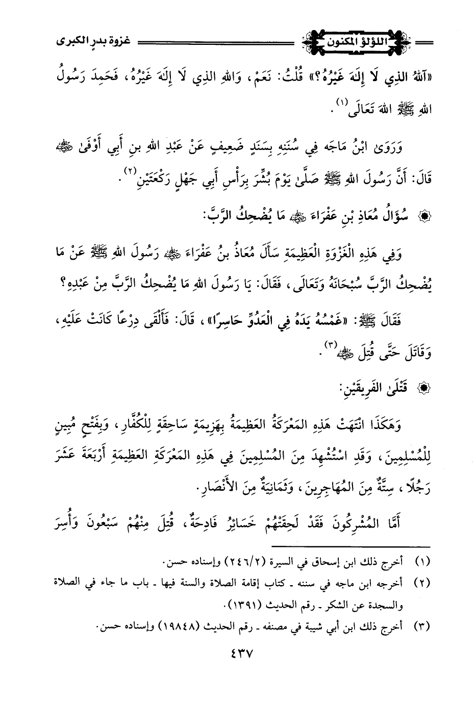 (¬2) أخرج ذلك ابن حبان في صحيحه - كتاب إخباره -صلى اللَّه عليه وسلم- عن مناقب الصحابة - باب ذكر أبي حذيفة بن عتبة بن ربيعة -رضي اللَّه عنه- رقم الحديث (7088) - وأخرجه الحاكم في المستدرك - كتاب معرفة الصحابة - باب كلام النبي -صلى اللَّه عليه وسلم- مع أموات المشركين - رقم الحديث (5045) وإسناده جيد - وأخرجه ابن إسحاق في السيرة (2/ 352) بدون سند.