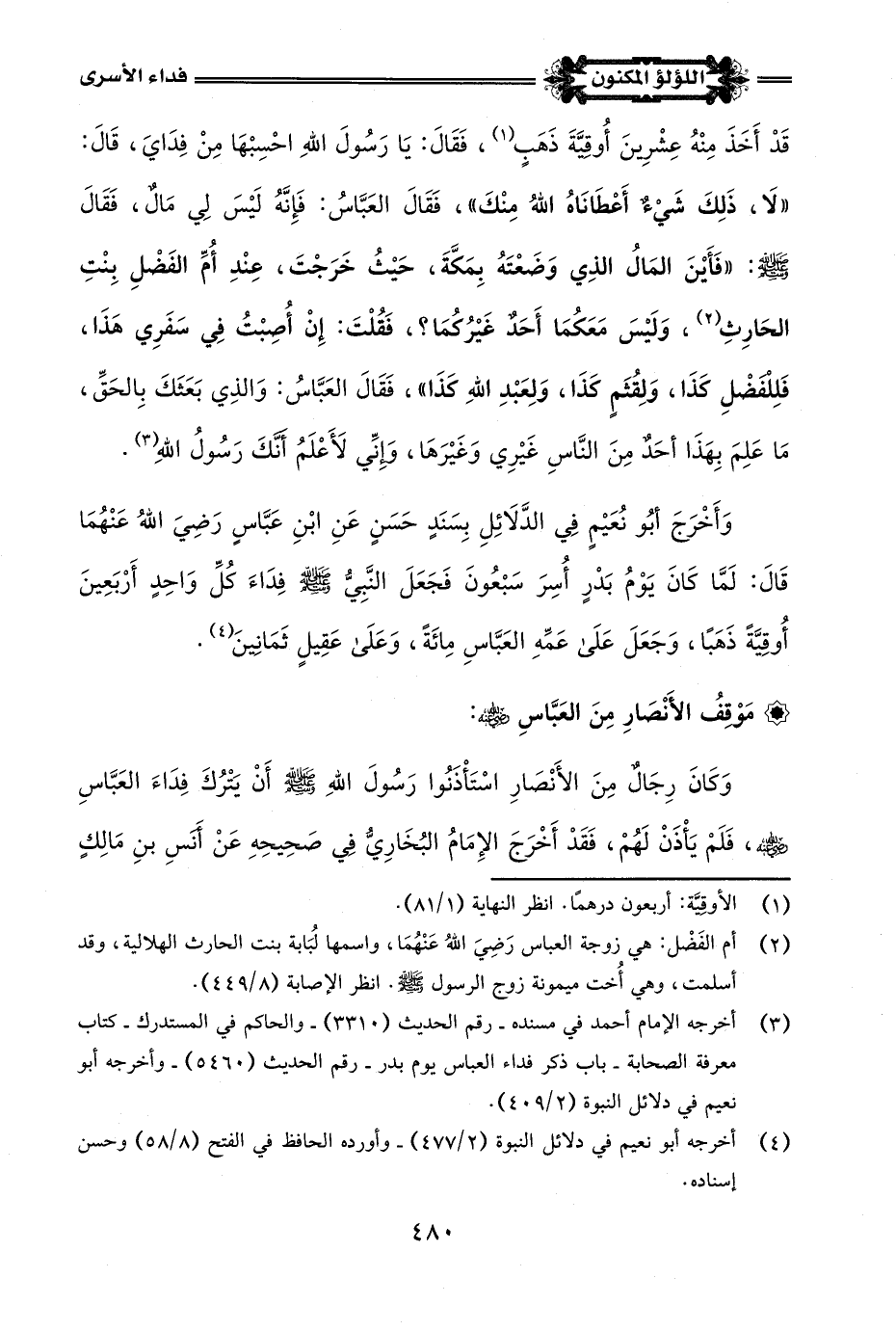 (¬3) أخرجه الإمام أحمد في مسنده - رقم الحديث (1610) - وابن حبان في صحيحه - كتاب إخباره -صلى اللَّه عليه وسلم- عن مناقب الصحابة - باب وصف المصطفى -صلى اللَّه عليه وسلم- عمه العباس بالجود والوصل - رقم الحديث (7052).
