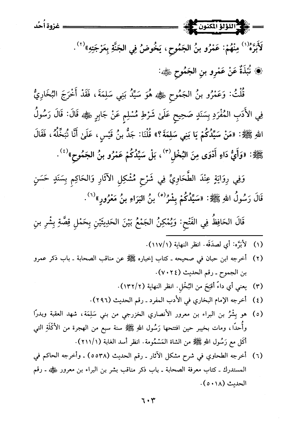 (¬3) أخرجه الحاكم في المستدرك - كتاب معرفة الصحابة - باب شهادة سعد بن الربيع -رضي اللَّه عنه- رقم الحديث (4958) - والإمام مالك في الموطأ - كتاب الجهاد - باب الترغيب في الجهاد - رقم الحديث (41).
