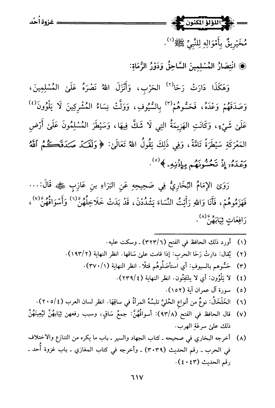 (¬1) قال البراء بن عازب -رضي اللَّه عنه- في تفسير هذه الآية، كما رواه عنه الإمام أحمد في مسنده بسند صحيح - رقم الحديث (18600): أي عصيتُمْ الرسول -صلى اللَّه عليه وسلم- من بعد ما أرَاكم الغَنَامْ وهزيمَةَ العدو.