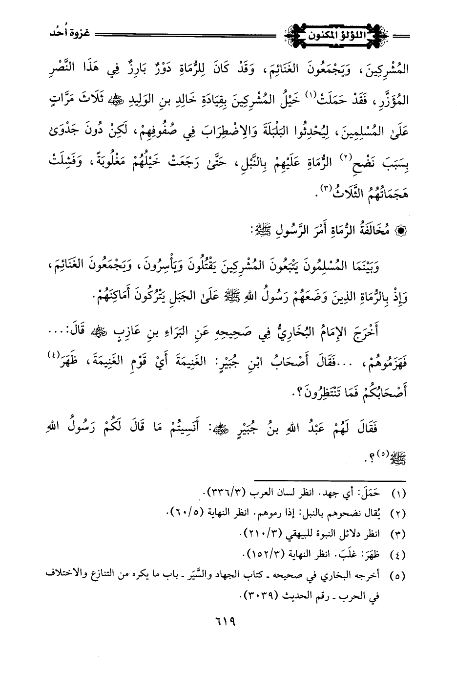 (¬2) قَالَ الحَافِظُ في الفَتْحِ (8/ 109): أي احتَرِزُوا من جهةِ أُخْرَاكم، وهي كلمةٌ تُقال لمَنْ يَخْشى أن يُؤْتى عندَ القتال من وَرَائه، وكان ذلك لما تَرَكَ الرُّماة مكانهم، ودَخَلُوا ينتَهِبُون عسكرَ المُشركين.