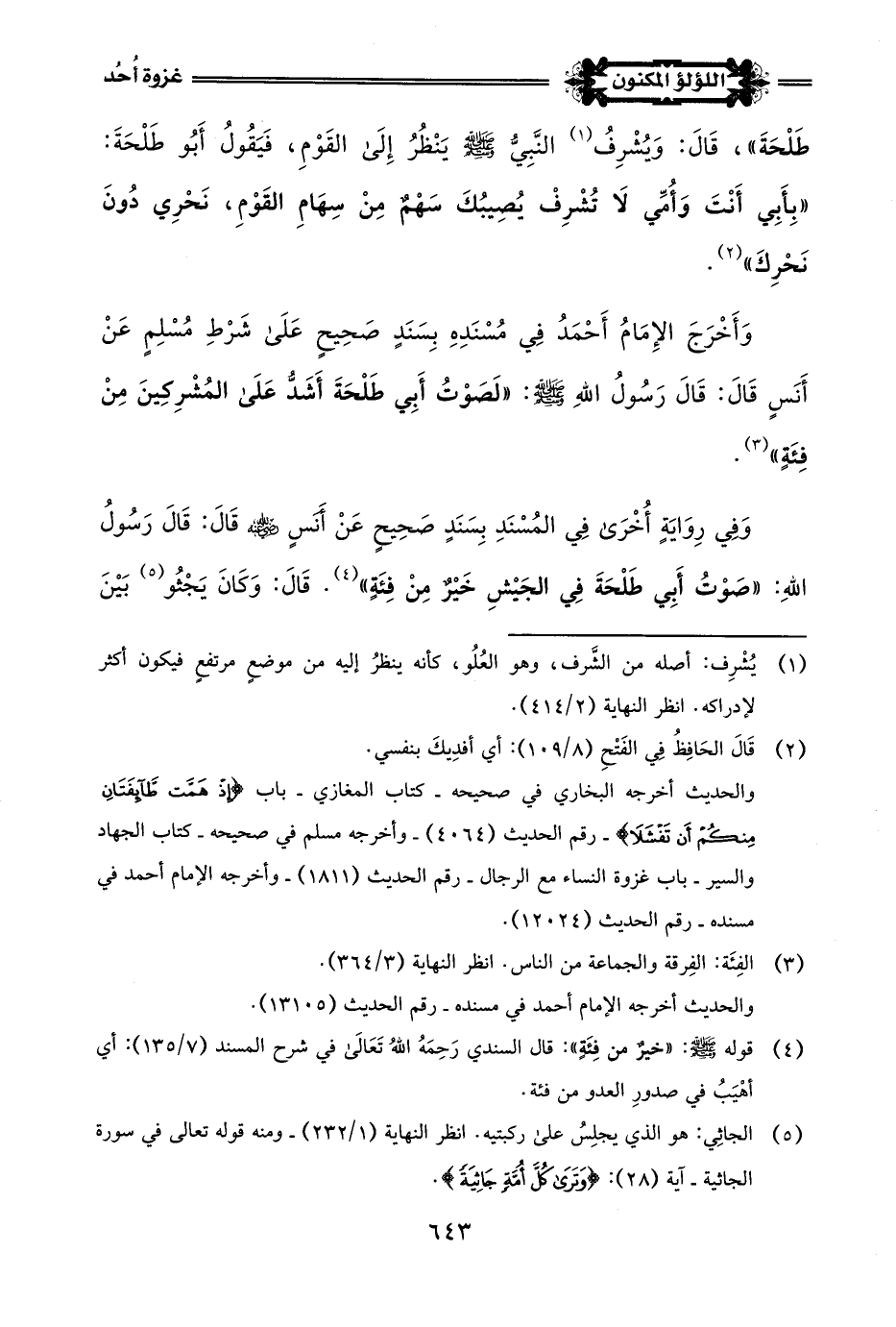 (¬6) أخرجه البخاري في صحيحه - كتاب الجهاد والسير - باب غزو النساء وقتالهن مع الرجال - رقم الحديث (2880) - وأخرجه في كتاب المغازي - باب {إِذْ هَمَّتْ طَائِفَتَانِ مِنْكُمْ أَنْ تَفْشَلَا} - رقم الحديث (4064) - وأخرجه الإمام مسلم في صحيحه - كتاب الجهاد والسير - باب غزوة النساء مع الرجال - رقم الحديث (1811).