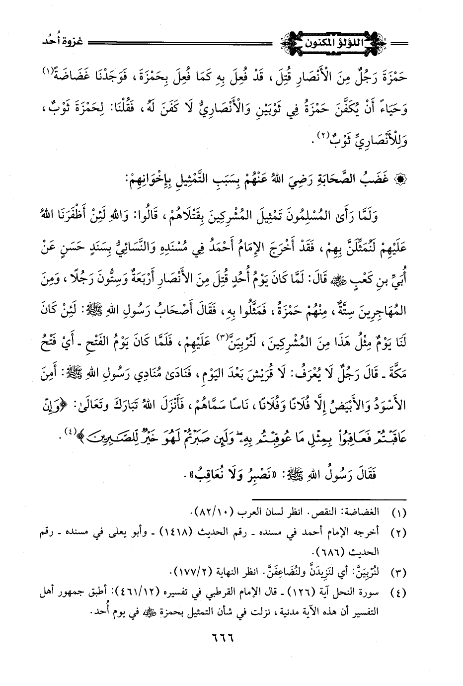 (¬1) أخرج الحاكم في المستدرك - كتاب معرفة الصحابة - باب استشهاد حمزة -رضي اللَّه عنه- رقم الحديث (4947) - وسكَتَ عليه، وقال الذهبي: سمعه أبو بكر بن عياش من يزيد، وليسا بمعتمدين، ولكن للحديث شواهد يصح بها، ففي الباب عن ابن مسعود -رضي اللَّه عنه- أخرجه الإمام أحمد في مسنده - رقم الحديث (4414) وهو حديث حسن لغيره - وعن عبد اللَّه بن الزبير، أخرجه الطحاوي في شرح معاني الآثار (1/ 290) وإسناده جيد.