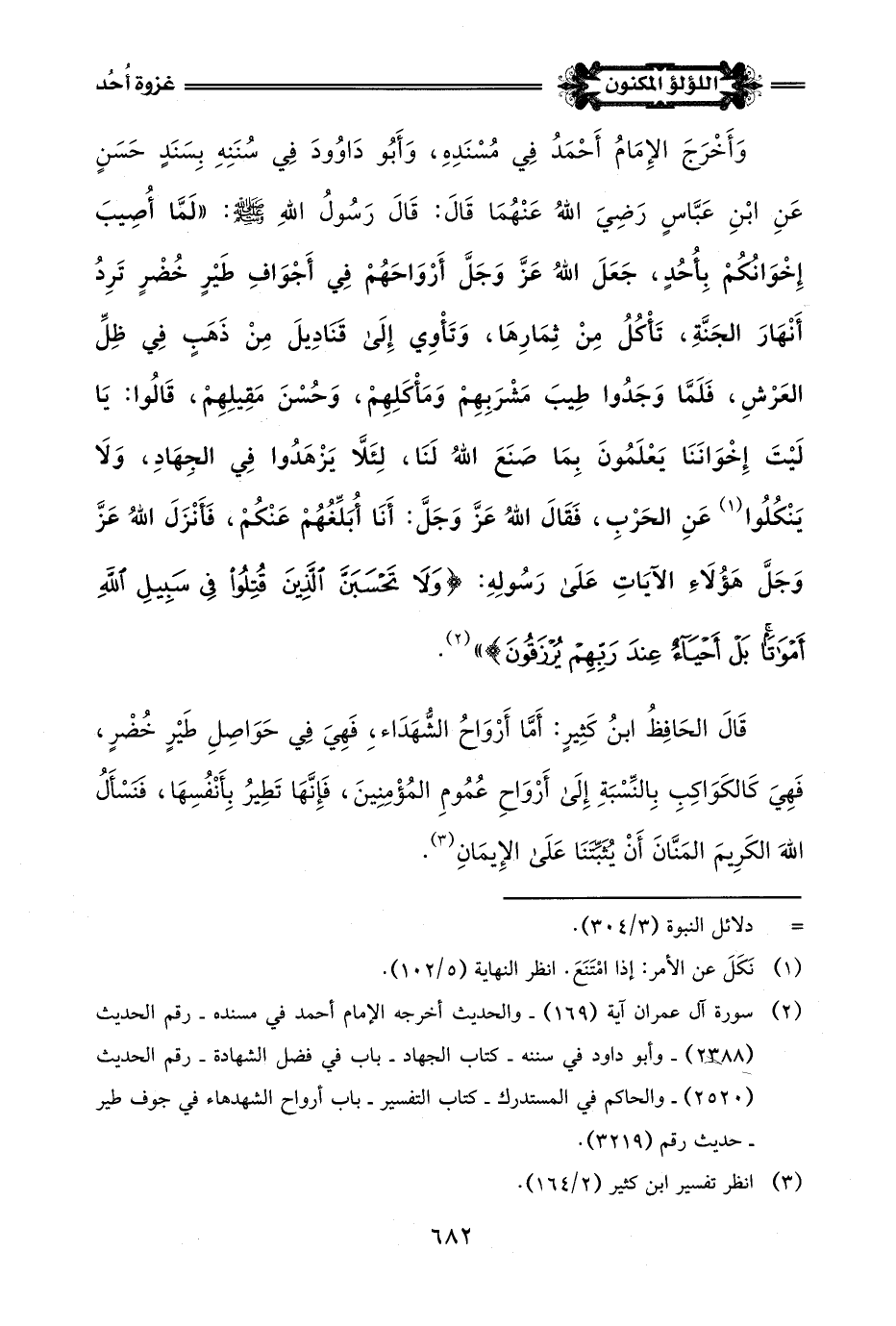 وَلَمَّا أَرَادَ رَسُولُ اللَّهِ -صلى اللَّه عليه وسلم- الرُّجُوعَ إِلَى المَدِينَةِ، وَمَعَهُ أَصْحَابُهُ، وَقَفَ عَلَى جَبَلِ أُحُدٍ، فَأَثْنَى عَلَى رَبِّهِ، وَتَضَرَّعَ إِلَيْهِ، فَقَدْ أَخْرَجَ الإِمَامُ أَحْمَدُ فِي مُسْنَدِهِ وَالحَاكِمُ وَالبُخَارِيُّ فِي الأَدَبِ المُفْرَدِ، بِسَنَدٍ صَحِيحٍ عَنْ عُبَيْدِ بنِ رِفَاعَةَ الزُّرَقِيِّ قَالَ: لَمَّا كَانَ يَوْمُ أُحُدٍ، وَانْكَفَأَ المُشْرِكُونَ، قَالَ رَسُولُ اللَّهِ -صلى اللَّه عليه وسلم-: "اسْتَوُوا حَتَّى أُثْنِيَ عَلَى رَبِّي"، فَصَاروا خَلْفَهُ صُفُوفًا، فَقَالَ -صلى اللَّه عليه وسلم-: "اللَّهُمَّ لَكَ الحَمْدُ كلُّهُ، اللَّهُمَّ لَا قَابِضَ لِمَا بَسَطْتَ، وَلَا بَاسِطَ لِمَا قَبَضْتَ، وَلَا هَادِيَ لِمَا أَضْلَلْتَ، وَلَا مُضِلَّ لِمَنْ هَدَيْتَ، وَلَا مُعْطِيَ لِمَا مَنَعْتَ، وَلَا مَانِعَ لِمَا أَعْطَيْتَ، وَلَا مُقَرِّبَ لِمَا بَاعَدْتَ، وَلَا مُبَاعِدَ لِمَا قَرَّبْتَ، اللَّهُمَّ ابْسُطْ عَلَيْنَا مِنْ بَرَكَاتِكَ وَرَحْمَتِكَ وَفَضْلِكَ وَرِزْقِكَ، اللَّهُمَّ إِنِّي أَسْأَلُكَ النَّعِيمَ المُقِيمَ الذِي لَا يَحُولُ ولَا يَزُولُ، اللَّهُمَّ إِنِّي أَسْألكَ النَّعِيمَ يَوْمَ العَيْلَةِ (¬1)، وَالأَمْنَ يَوْمَ الخَوْفِ، اللَّهُمَّ إِنِّي عَائِذٌ بِكَ مِنْ شَرِّ مَا أَعْطَيْتَنَا، وَشَرِّ مَا مَنَعْتَ، اللَّهُمَّ حَبِّبْ إِلَيْنَا الإِيمَانَ، وَزَيِّنْهُ فِي قُلُوبِنَا، وَكَرِّهْ إِلَيْنَا الكُفْرَ وَالفُسُوقَ وَالعِصْيَانَ، وَاجْعَلْنَا مِنَ الرَّاشِدِينَ، اللَّهُمَّ تَوَفَّنَا مُسْلِمِينَ، وَأَحْيِنَا مُسْلِمِينَ، وَأَلْحِقْنَا بِالصَّالِحِينَ غَيْرَ خَزَايَا وَلَا مَفْتُونِينَ، اللَّهُمَّ قَاتِلِ الكَفَرَةَ الذِينَ يُكَذِّبُونَ رُسُلَكَ، وَيَصُدُّونَ عَنْ سَبِيلِكَ، وَاجْعَلْ عَلَيْهِمْ رِجْزَكَ وعَذَابَكَ،