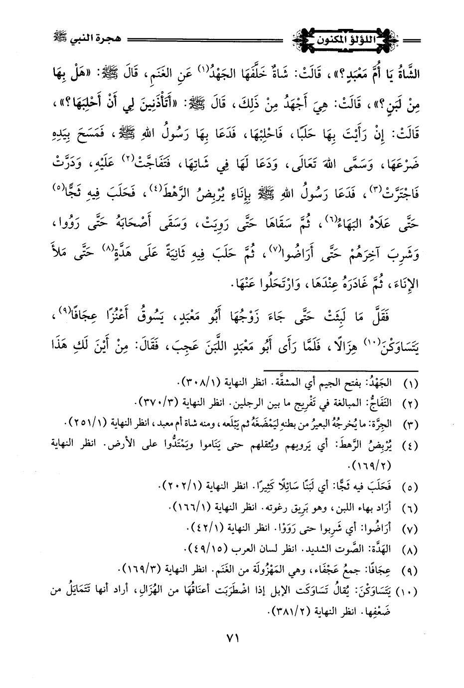 أَكْمَلَ الرَّسُولُ -صلى اللَّه عليه وسلم- طَرِيقَهُ إِلَى المَدِينَةِ وَمَعَهُ صَاحِبُهُ أَبُو بَكْرٍ الصِّدِّيقُ -رضي اللَّه عنه- وَعَامِرُ بنُ فُهَيْرَةَ -رضي اللَّه عنه-، وَالدَّلِيلُ عَبْدُ اللَّهِ بنُ أُرَيْقِطٍ، وَفِي الطَّرِيقِ مَرُّوا عَلَى خَيْمَةِ أَمٍّ مَعْبَدٍ الخُزَاعِيَّةِ، وَكَانَ مَنْزِلُهَا بِقُدَيْدٍ (¬1)، وَكَانَتْ امْرَأَةً بَرْزَةً (¬2) جَلْدَةً (¬3) تَحْتَبِي (¬4) بِفِنَاءِ (¬5) الخَيْمَةِ، ثُمَّ تَسْقِي وَتُطْعِمُ مَنْ مَرَّ بِهَا، فَسَأَلَاهَا: لَحْمًا وَتَمْرًا لِيَشْتَرُوا مِنْهَا، فَلَمْ يَجْدُوا عِنْدَهَا شَيْئًا مِنْ ذَلِكَ، وَكَانَ القَوْمُ مُرْمِلِينَ (¬6) مُسْنِتِينَ (¬7)، فنَظَرَ رَسُولُ اللَّهِ -صلى اللَّه عليه وسلم- إِلَى شَاةٍ فِي جَانِبِ الخَيْمَةِ، فَقَالَ -صلى اللَّه عليه وسلم-: "مَا هَذِهِ الشَّاةُ يَا أُمَّ مَعْبَدٍ؟ "، قَالَتْ: شَاةٌ خَلَّفَهَا الجَهْدُ (¬8) عَنِ الغَنَمِ، قَالَ -صلى اللَّه عليه وسلم-: "هَلْ بِهَا مِنْ لَبَنٍ؟ "، قَالَتْ: هِيَ أَجْهَدُ مِنْ ذَلِكَ، قَالَ -صلى اللَّه عليه وسلم-: "أَتأْذَنِينَ لِي أَنْ أَحْلِبَهَا؟ "، قَالَتْ: إِنْ رَأَيْتَ بِهَا حَلَبًا، فَاحْلِبْهَا، فَدَعَا بِهَا رَسُولُ اللَّهِ -صلى اللَّه عليه وسلم-، فَمَسَحَ بِيَدِهِ