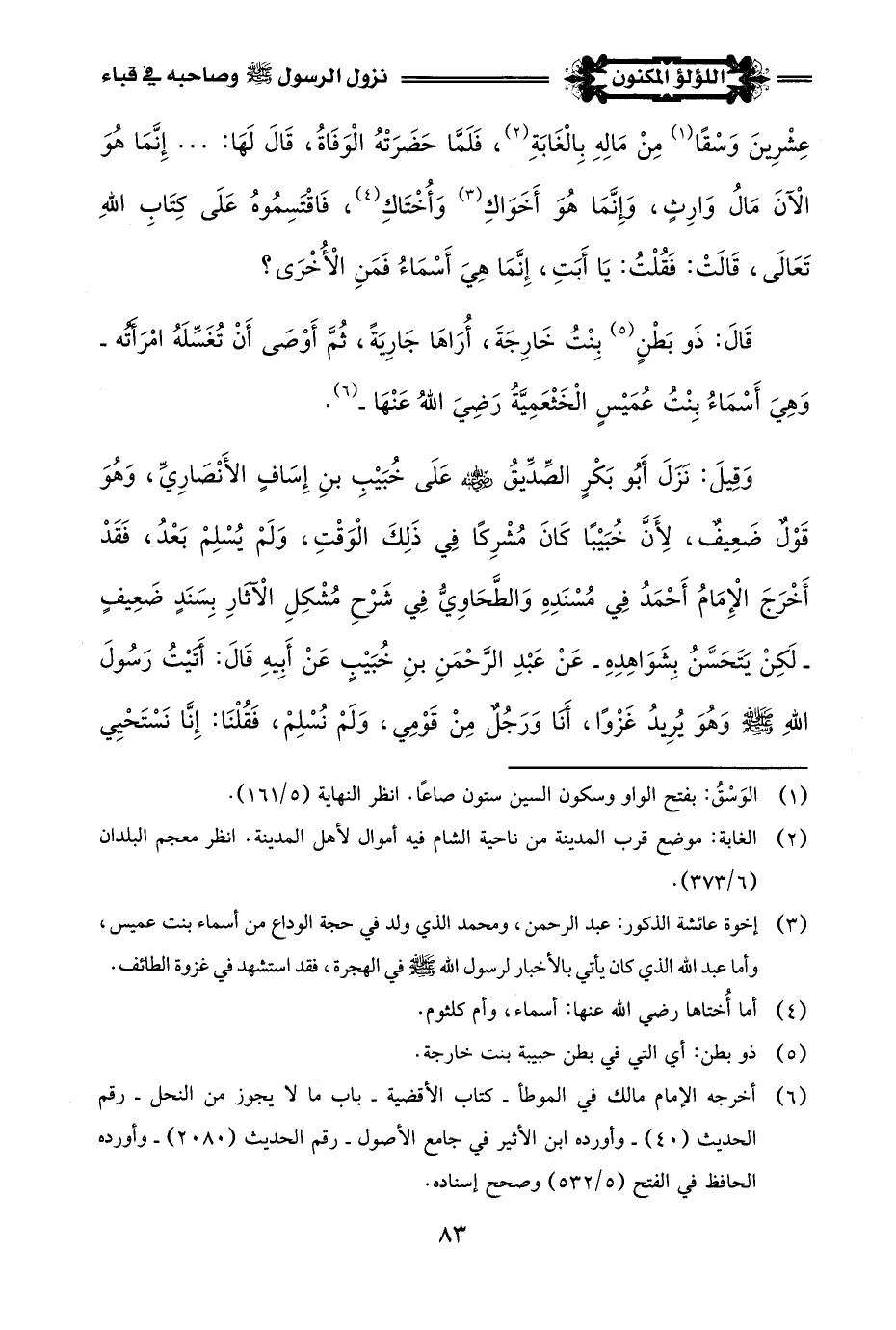 عِشْرِينَ وَسْقًا (¬1) مِنْ مَالِهِ بِالْغَابَةِ (¬2)، فَلَمَّا حَضَرَتْهُ الْوَفَاةُ، قَالَ لَهَا: . . . إِنَّمَا هُوَ الْآنَ مَالُ وَارِثٍ، وَإِنَّمَا هُوَ أَخَوَاكِ (¬3) وَأُخْتَاكِ (¬4)، فَاقْتَسِمُوهُ عَلَى كِتَابِ اللَّهِ تَعَالَى، قَالَتْ: فَقُلْتُ: يَا أَبَتِ، إِنَّمَا هِيَ أَسْمَاءُ فَمَنِ الْأُخْرَى؟