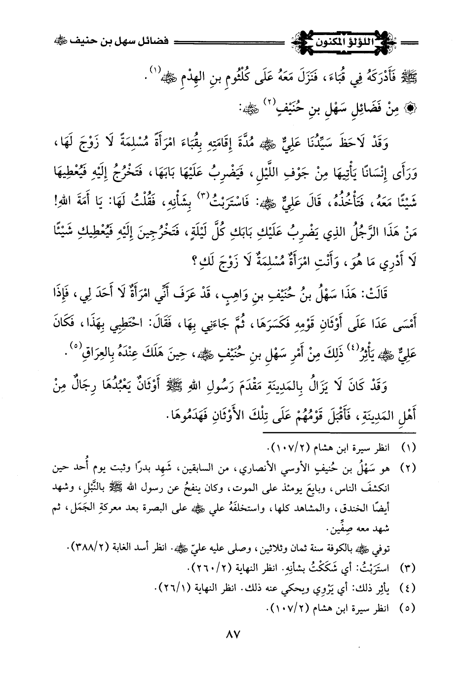 قَالَتْ: هَذَا سَهْلُ بنُ حُنَيْفِ بنِ وَاهِبٍ، قَدْ عَرَفَ أَنِّي امْرَأَةٌ لَا أَحَدَ لِي، فَإِذَا أَمْسَى عَدَا عَلَى أَوْثَانِ قَوْمِهِ فكسَرَهَا، ثُمَّ جَاءَنِي بِهَا، فَقَالَ: احْتَطِبِي بِهَذَا، فَكَانَ عَلِيٌّ -رضي اللَّه عنه- يَأْثِرُ (¬3) ذَلِكَ مِنْ أَمْرِ سَهْلِ بنِ حُنَيْفٍ -رضي اللَّه عنه-، حِينَ هَلَكَ عِنْدَهُ بِالعِرَاقِ (¬4).