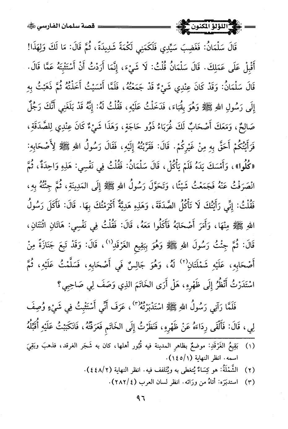 قَالَ سَلْمَانُ: فَغَضِبَ سَيِّدِي فَلَكَمَنِي لَكْمَةً شَدِيدَةً، ثُمَّ قَالَ: مَا لَكَ وَلهَذَا! أَقْبِلْ عَلَى عَمَلِكَ. قَالَ سَلْمَانُ قُلْتُ: لَا شَيْءَ، إِنَّمَا أَرَدْتُ أَنْ أَسْتَثْبِتَهُ عَمَّا قَالَ. قَالَ سَلْمَانُ: وَقَدْ كَانَ عِنْدِي شَيْءٌ قَدْ جَمَعْتُهُ، فَلَمَّا أَمْسَيْتُ أَخَذْتُهُ ثُمَّ ذَهَبْتُ بِهِ إِلَى رَسُولِ اللَّهِ -صلى اللَّه عليه وسلم- وَهُوَ بِقُبَاءَ، فَدَخَلْتُ عَلَيْهِ، فَقُلْتُ لَهُ: إِنَّهُ قَدْ بَلَغَنِي أَنَّكَ رَجُلٌ صَالِحٌ، وَمَعَكَ أَصْحَابٌ لَكَ غُرَبَاءُ ذَوُو حَاجَةٍ، وَهَذَا شَيْءٌ كَانَ عِنْدِي لِلصَّدَقَةِ، فَرَأَيْتُكُمْ أَحَقَّ بِهِ مِنْ غَيْرِكُمْ. قَالَ: فَقَرَّبْتُهُ إِلَيْهِ، فَقَالَ رَسُولُ اللَّهِ -صلى اللَّه عليه وسلم- لِأَصْحَابِهِ: "كلُوا"، وَأَمْسَكَ يَدَهُ فَلَمْ يَأْكُلْ، قَالَ سَلْمَانُ: فَقُلْتُ فِي نَفْسِي: هَذِهِ وَاحِدَةٌ، ثُمَّ انْصَرَفْتُ عَنْهُ فَجَمَعْتُ شَيْئًا، وَتَحَوَّلَ رَسُولُ اللَّهِ -صلى اللَّه عليه وسلم- إِلَى المَدِينَةِ، ثُمَّ جِئْتُهُ بِهِ، فَقُلْتُ: إِنِّي رَأَيْتُكَ لَا تَأْكُلُ الصَّدَقَةَ، وَهَذِهِ هَدِيَّةٌ أَكْرَمْتُكَ بِهَا. قَالَ: فَأَكَلَ رَسُولُ اللَّهِ -صلى اللَّه عليه وسلم- مِنْهَا، وَأَمَرَ أَصْحَابَهُ فَأَكَلُوا مَعَهُ، قَالَ: فَقُلْتُ في نَفْسِي: هَاتَانِ اثْنَتَانِ، قَالَ: ثُمَّ جِئْتُ رَسُولَ اللَّهِ -صلى اللَّه عليه وسلم- وَهُوَ بِبَقِيعِ الغَرْقَدِ (¬1)، قَالَ: وَقَدْ تَبعَ جَنَازَةً مِنْ أَصْحَابِهِ، عَلَيْهِ شَمْلَتَانِ (¬2) لَهُ، وَهُوَ جَالِسٌ فَي أَصْحَابِهِ، فَسَلَّمْتُ عَلَيْهِ، ثُمَّ اسْتَدَرْتُ أَنْظُرُ إِلَى ظَهْرِهِ، هَلْ أَرَى الخَاتَمَ الذِي وَصَفَ لِي صَاحِبِي؟