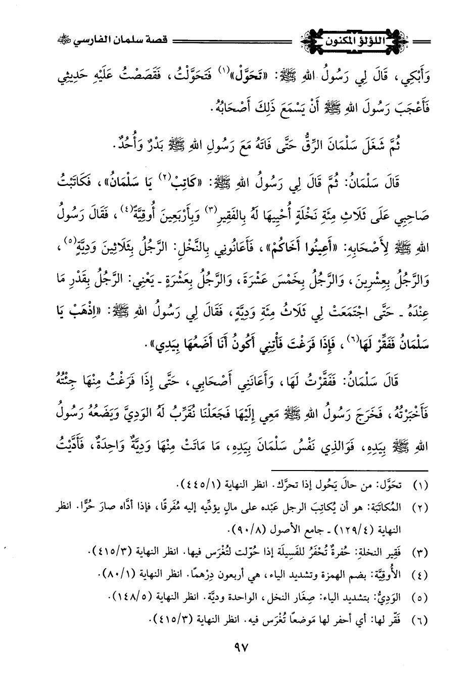 قَالَ سَلْمَانُ: ثُمَّ قَالَ لِي رَسُولُ اللَّهِ -صلى اللَّه عليه وسلم-: "كَاتِبْ (¬2) يَا سَلْمَانُ"، كَاتَبْتُ صَاحِبِي عَلَى ثَلَاثِ مِئَةِ نَخْلَةٍ أُحْيِيهَا لَهُ بِالفَقِيرِ (¬3) وَبِأَرْبَعِينَ أُوقِيَّةً (¬4)، فَقَالَ رَسُولُ اللَّهِ -صلى اللَّه عليه وسلم- لِأَصْحَابِهِ: "أَعِينُوا أَخَاكُمْ"، فَأَعَانُونِي بِالنَّخْلِ: الرَّجُلُ بِثَلَاثِينَ وَدِيَّةٍ (¬5)، وَالرَّجُلُ بِعِشْرِينَ، وَالرَّجُلُ بِخَمْسَ عَشْرَةَ، وَالرَّجُلُ بِعَشْرَةٍ -يَعْنِي: الرَّجُلُ بِقَدْرِ مَا عِنْدَهُ- حَتَّى اجْتَمَعَتْ لِي ثَلَاثُ مِئَةِ وَدِيَّةٍ، فَقَالَ لِي رَسُولُ اللَّهِ -صلى اللَّه عليه وسلم-: "اذْهَبْ يَا سَلْمَانُ فَفَقِّرْ لَهَا (¬6)، فَإِذَا فَرَغْتَ فَأْتني أَكُونُ أَنَا أَضَعُهَا بِيَدِي".
