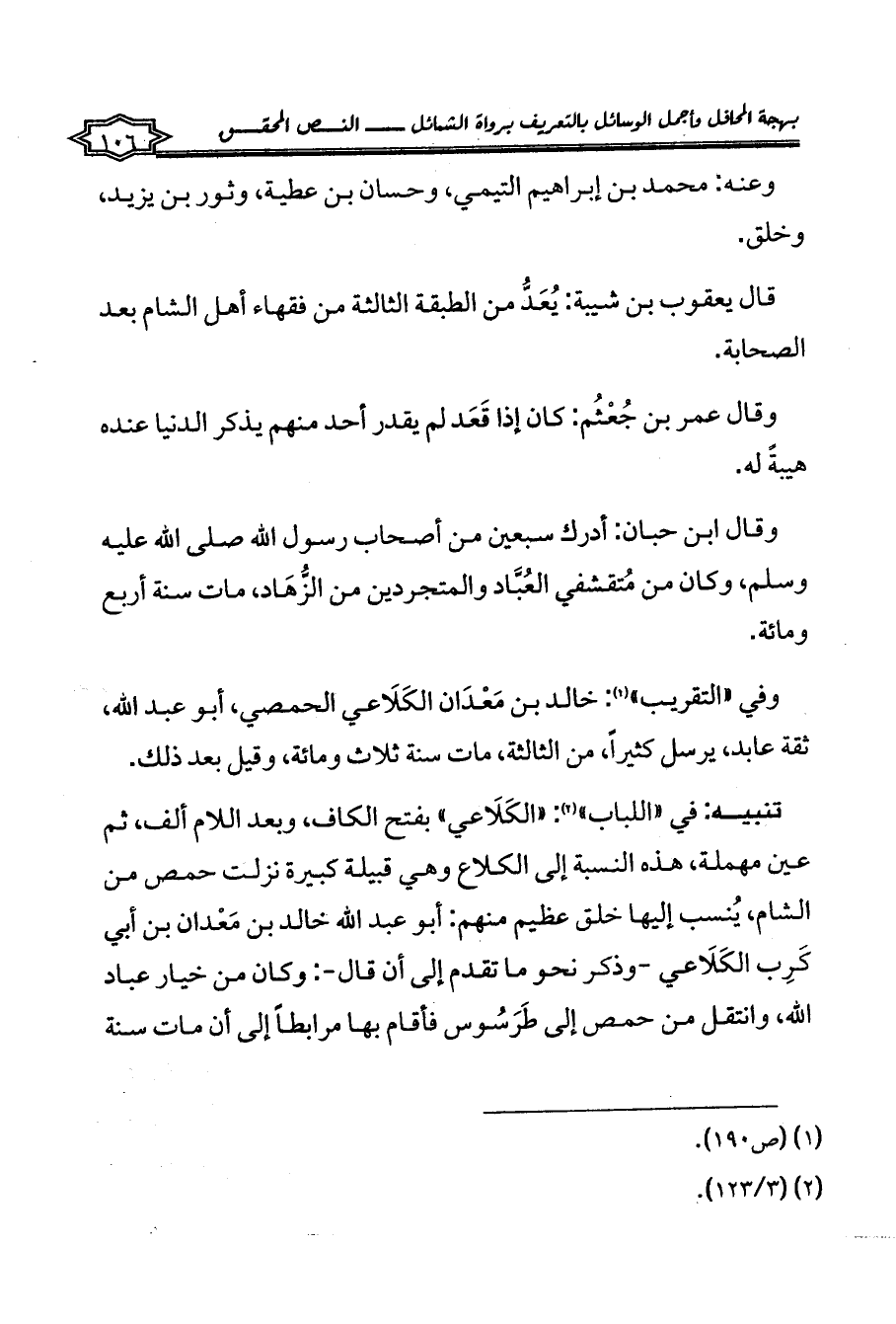وفي «التقريب» (¬1): خالد بن مَعْدَان الكَلَاعي الحمصي، أبو عبد الله، ثقة عابد، يرسل كثيراً، من الثالثة، مات سنة ثلاث ومائة، وقيل بعد ذلك.