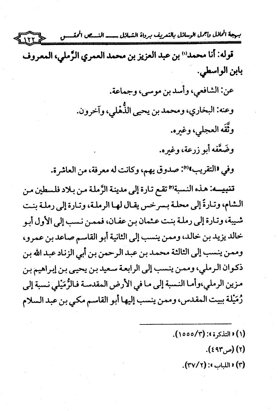 تنبيه: هذه النسبة (¬3) تقع تارة إلى مدينة الرَّملة من بلاد فلسطين من الشام، وتارةً إلى محلة بسرخس يقال لها الرملة، وتارة إلى رملة بنت شيبة، وتارة إلى رملة بنت عثمان بن عفان، فممن نسب إلى الأول أبو خالد يزيد بن خالد، وممن ينسب إلى الثانية أبو القاسم صاعد بن عمرو، وممن ينسب إلى الثالثة محمد بن عبد الرحمن بن أبي الزناد عبد الله بن ذكوان الرملي، وممن ينسب إلى الرابعة سعيد بن يحيى بن إبراهيم بن مزين الرملي، وأما النسبة إلى ما في الأرض المقدسة فالرُّمَيْلي نسبة إلى رُمَيْلة ببيت المقدس، وممن ينسب إليها أبو القاسم مكي بن عبد السلام