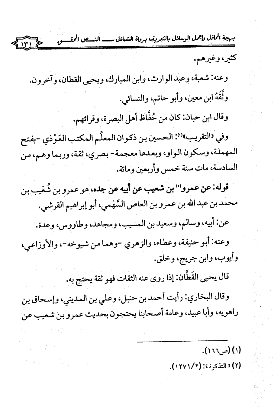 وقال البخاري: رأيت أحمد بن حنبل، وعلي بن المديني، وإسحاق بن راهويه، وأبا عبيد، وعامة أصحابنا يحتجون بحديث عمرو بن شعيب عن